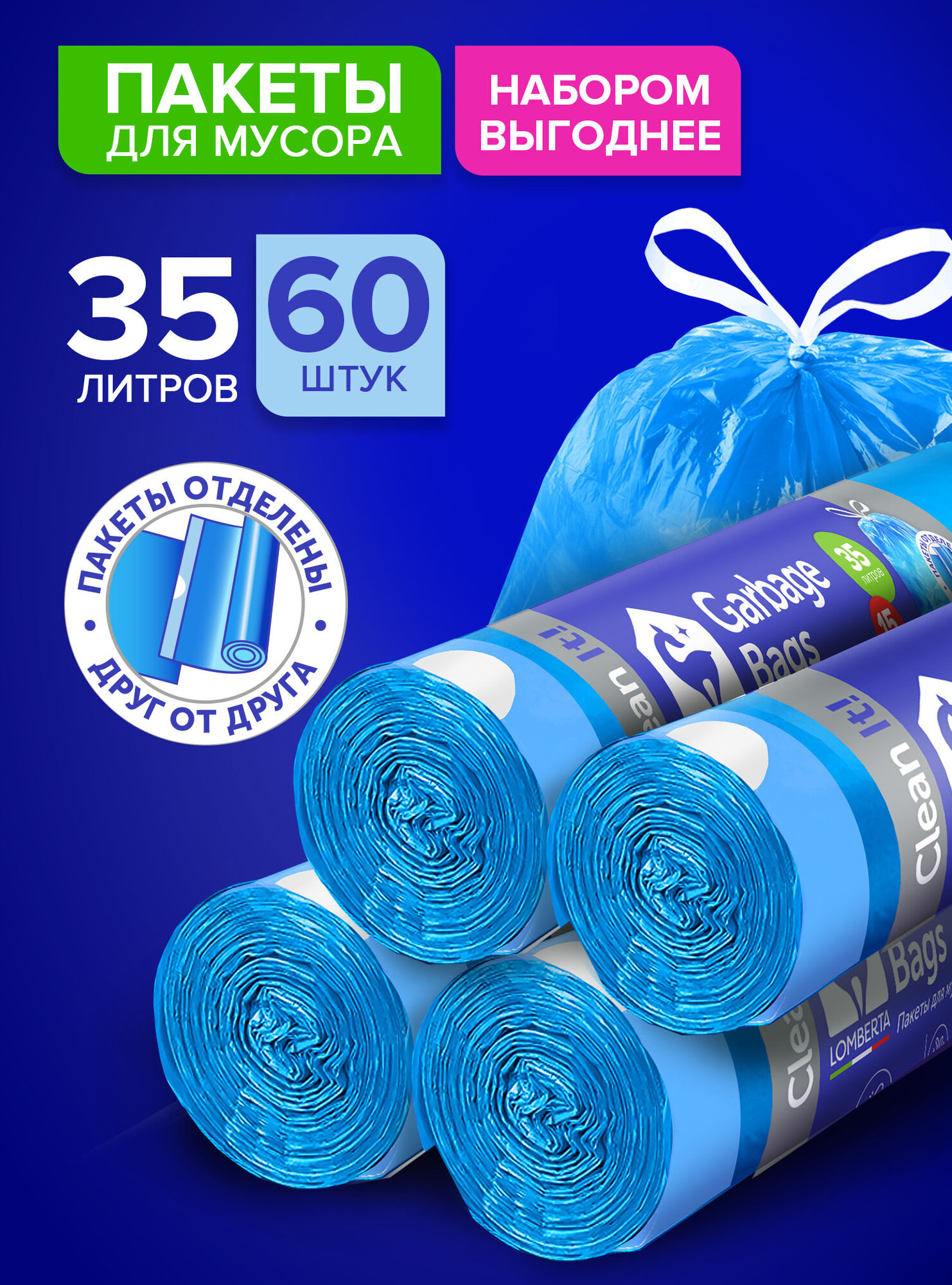 Мешки для мусора Lomberta 35 л, 60 шт, с завязками, плотные, в рулоне, пакеты уже оторваны информация: