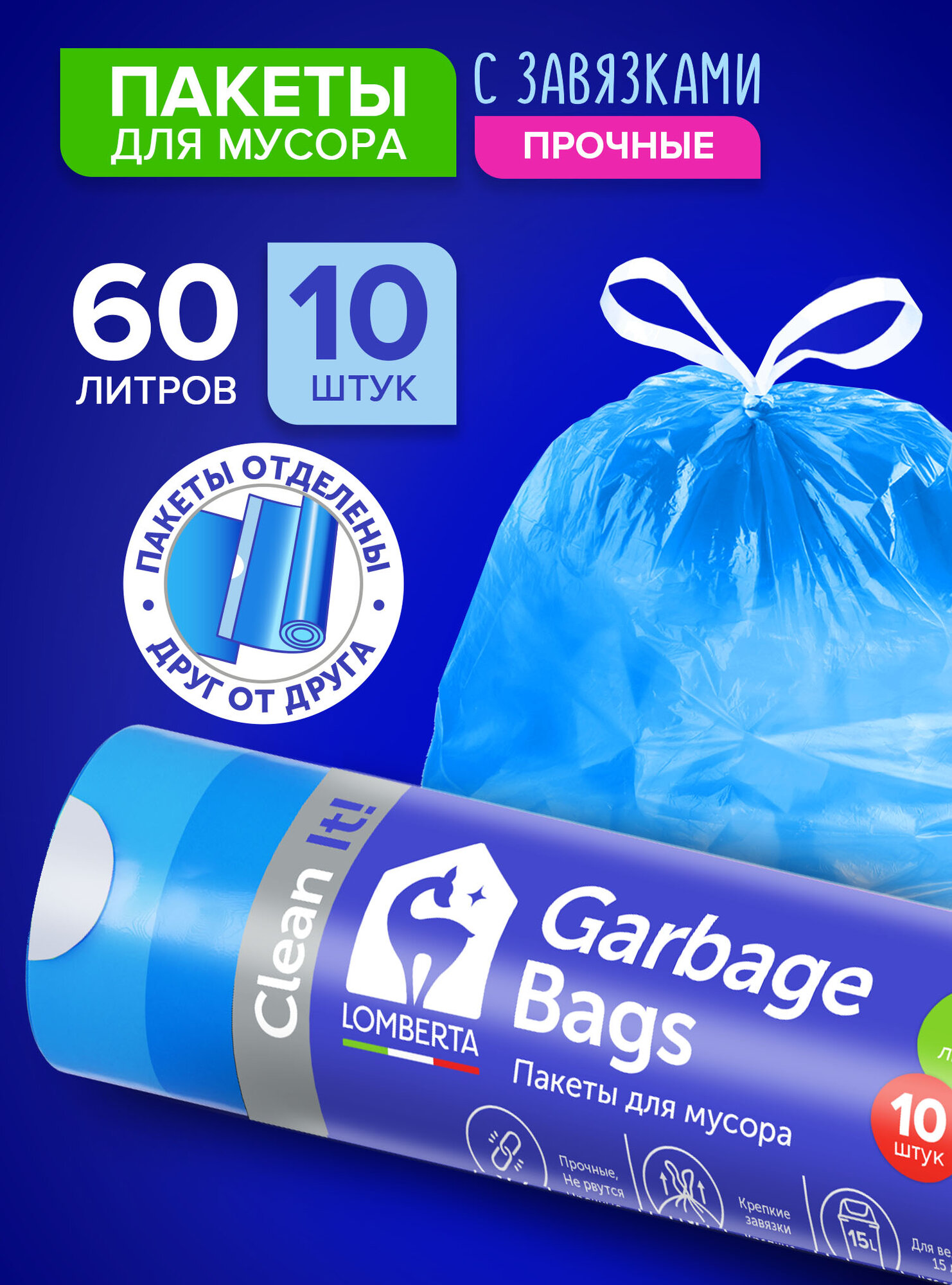 Мешки для мусора Lomberta 60 л, 10 шт, плотные с завязками, пакеты уже оторваны друг от друга и сложены в рулон информация: