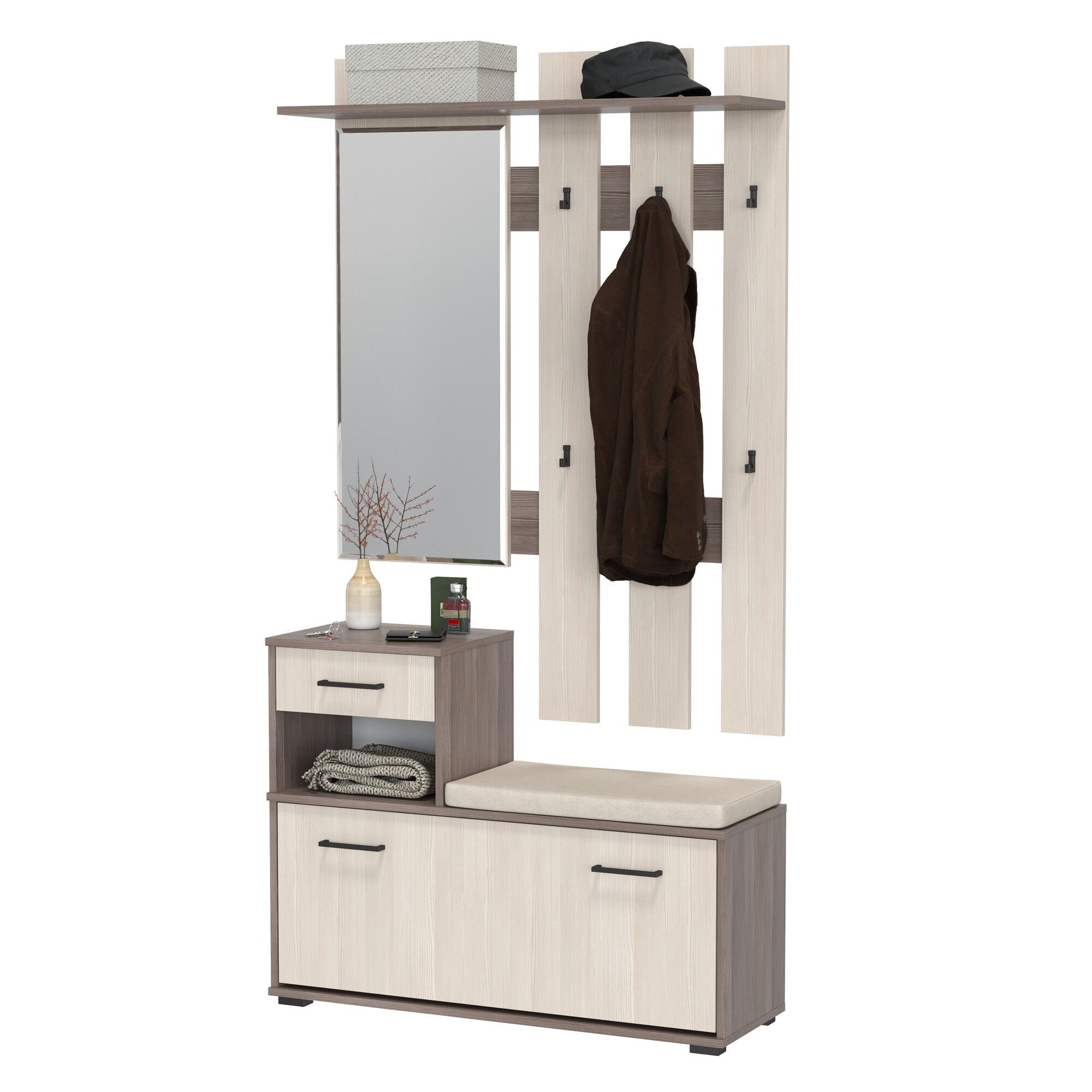 Прихожая комплект САША-6 (правая) от Фант-Мебель, с зеркалом, с обувницей, шкафом и ящиками, 156x203,6x43 см. Ясень темный/Ясень светлый