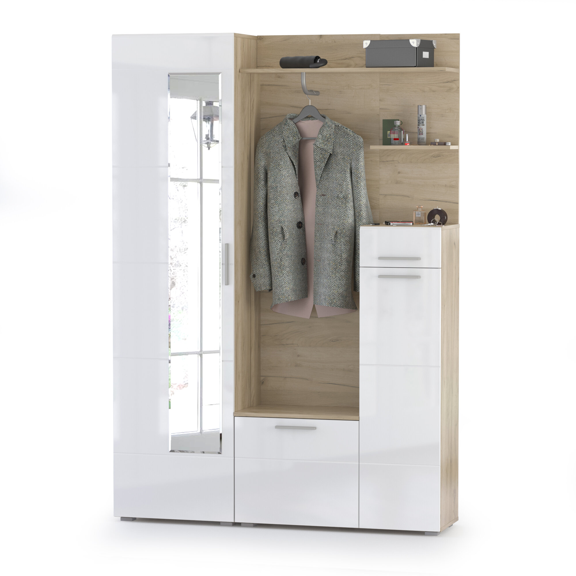 | Состав комплекта | представляет собой панель / комбинирующую открытую вешалку / две распашные тумбы и шкаф для одежды с зеркалом на двери |