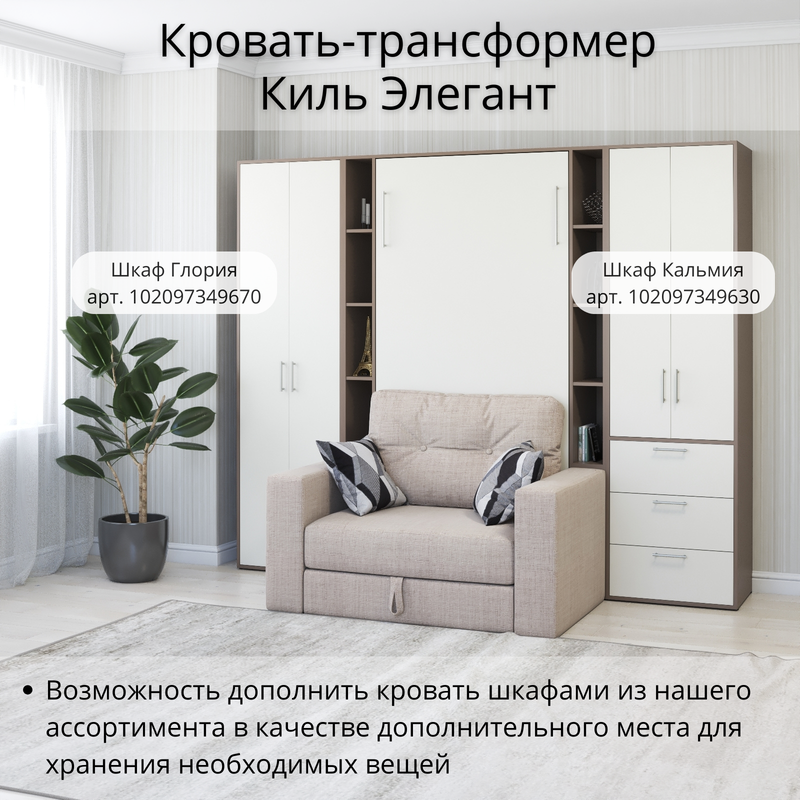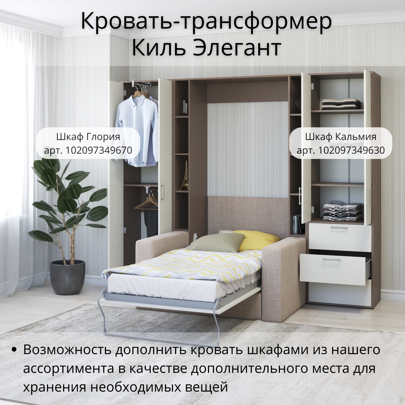 Шкаф кровать трансформер с креплением к стене, Stylint, Киль Элегант, 90х200, Мокко/Белый платиновый информация: