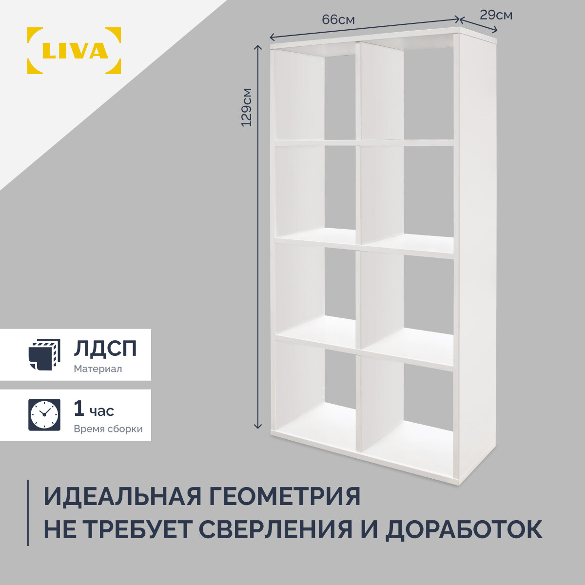 Стеллаж деревянный Фридлев напольный для игрушек, книг, цветов, 8 секций, белый, 66х129х29, LIVA Мебельные решения информация: