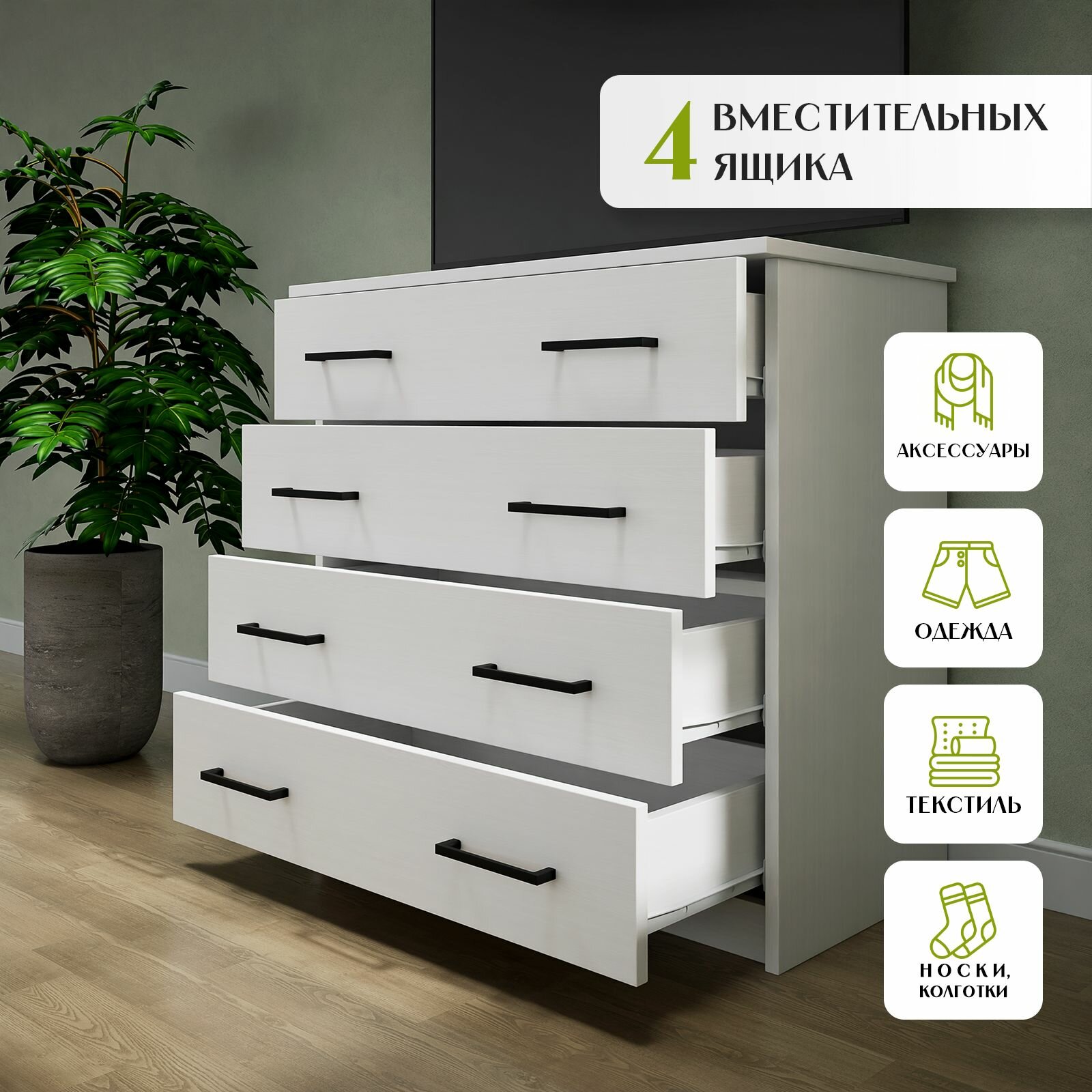 Комод для одежды с 4 ящиками, с ручками, большой Мальта Plus Белый деревянный информация: