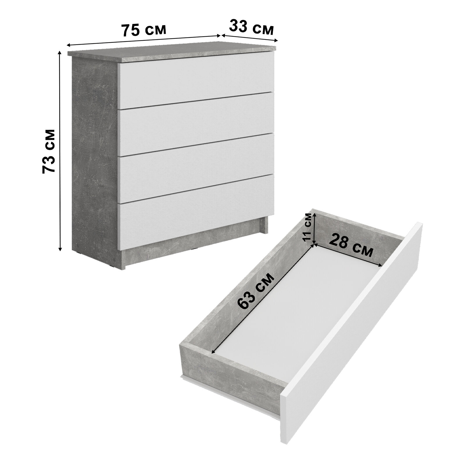 Комод Ультра 4 ящика Бетон / Белое тиснение деревянный для одежды информация: