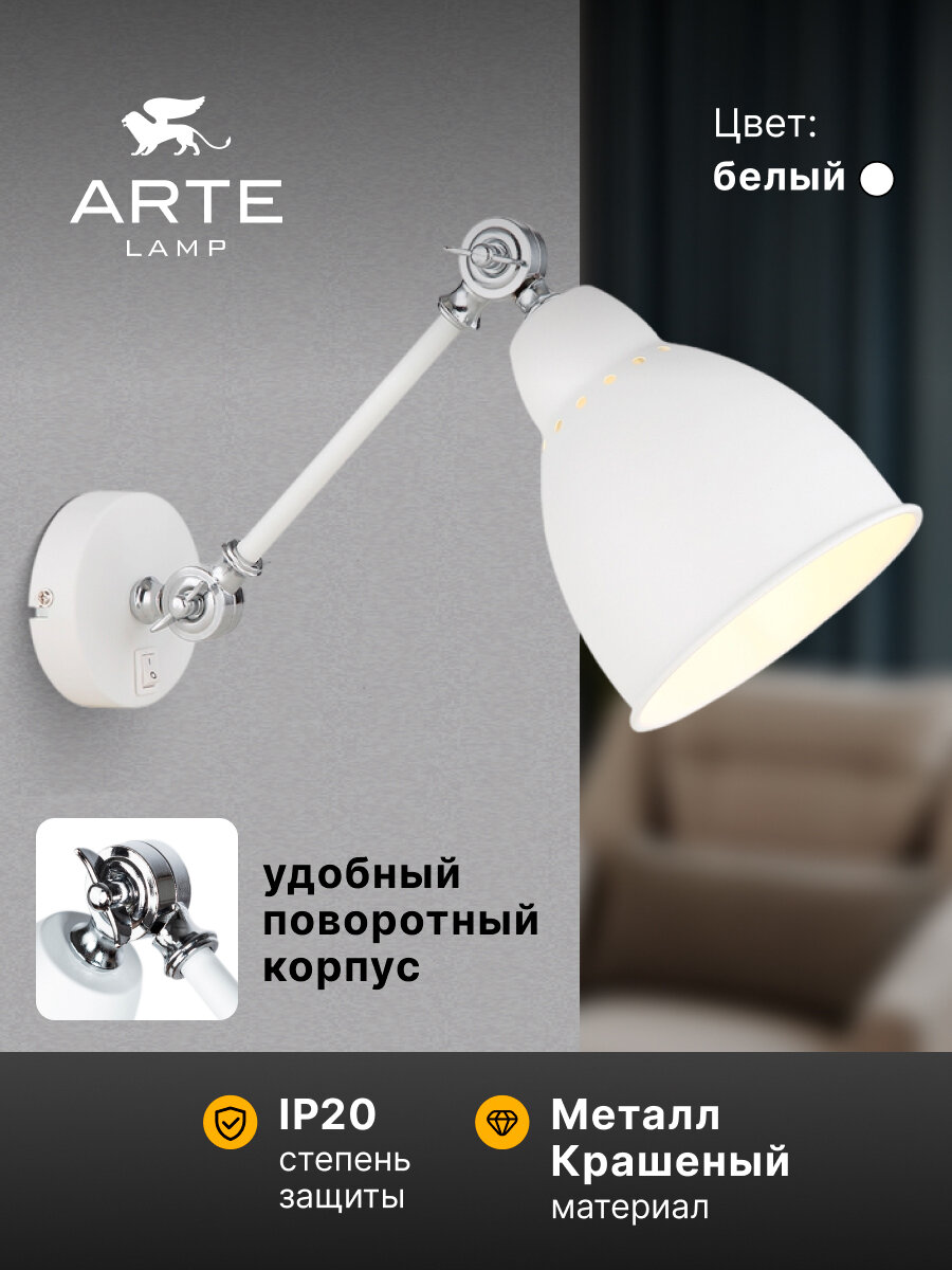 Бра настенный Arte Lamp BRACCIO A2054AP-1WH, E27 60 Вт белый информация: