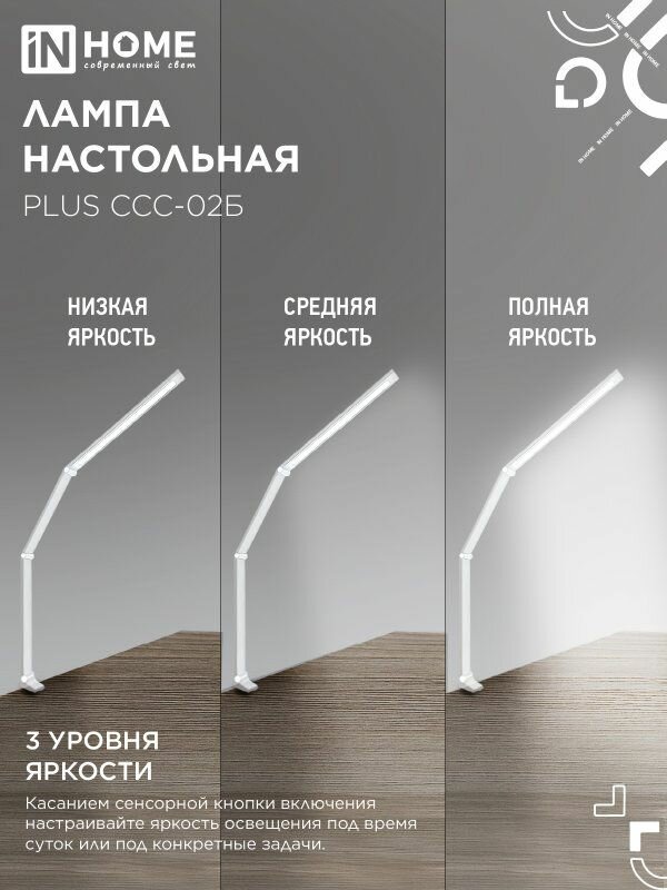 Светильник настольный светодиодный PLUS ССС-02Б 15Вт 3000-6500К 600Лм USB, с адаптером, струбцина белый IN HOME информация: