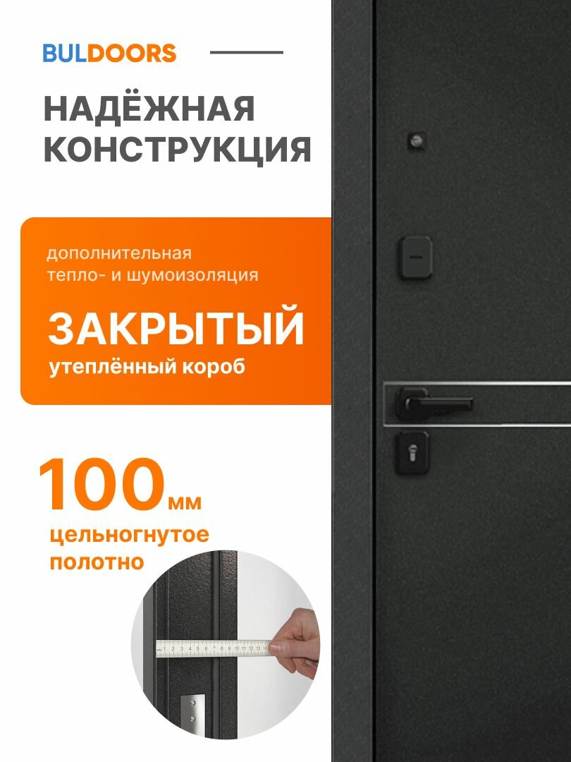 | Дополнительная информация | короб закрытый, цилиндровый замок с вертушком, черная квадратная фурнитура, 3 петли на подшипниках, 3 контура уплотнения, внутренняя панель МДФ 10 мм |