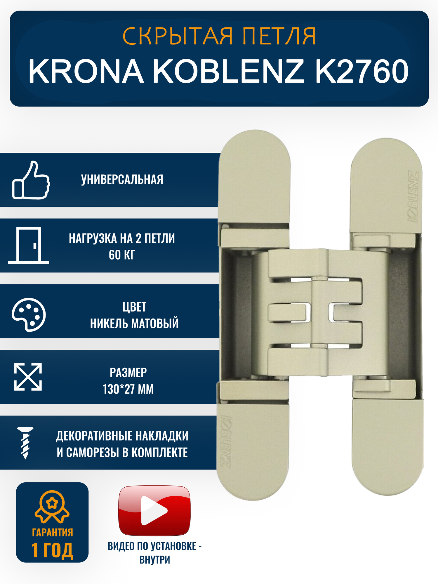 Петли дверные скрытые KRONA KOBLENZ K2760 NS 1 шт, никель матовый информация:
