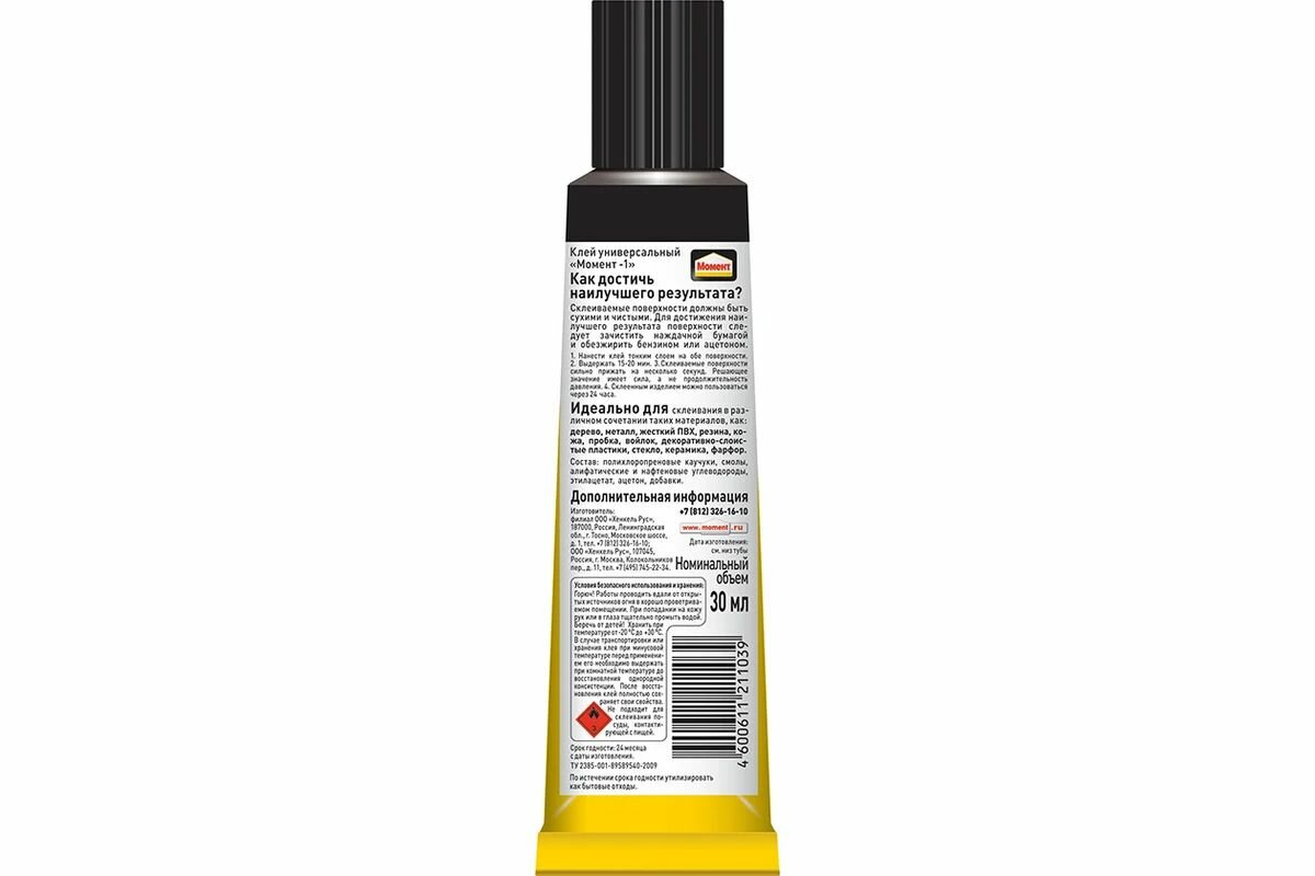 | Дополнительная информация | не рекомендуется склеивать посуду, контактирующую с пищей; ТУ 2385-005-89589540-2009; теплостойкость клеевого шва: от минус 40°C до плюс 70ºC; плотность: 0.86-0,89 г/см³; расход: 250- 350 г/м² при нанесении на обе поверхности |