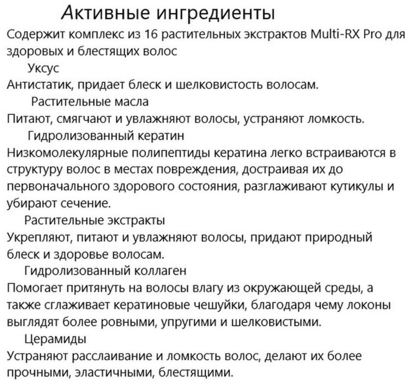 | Активный ингредиент | аллантоин / аминокислоты / витамин E / гиалуроновая кислота / глицерин / керамиды / кератин / коллаген / лимонная кислота / молочная кислота / ниацинамид / пантенол / пептиды / протеины / протеины шелка / цетримониум хлорид / яблочный уксус |