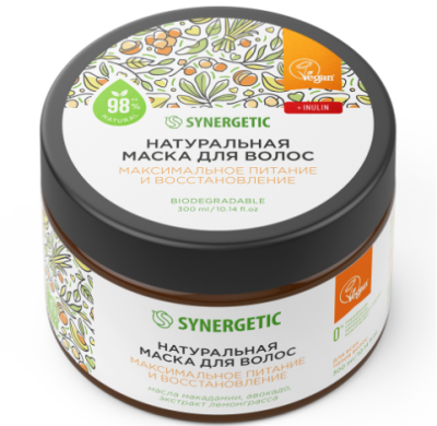 Натуральная маска для волос SYNERGETIC, максимальное питание и восстановление, 300 мл, 2 шт информация: