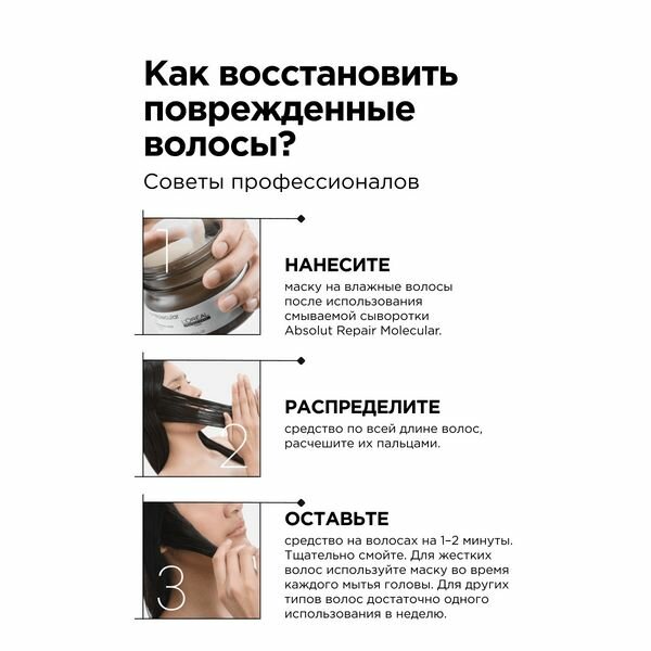 | Способ применения | После применения шампуня и смываемой сыворотки Absolut Repair Molecular, нанесите на влажные волосы. Распределите по всей длине волос. Оставьте средство на волосах на 1-2 минуты. Тщательно смойте. Для жестких волос используйте маску во время каждого мытья головы. Для других типов волос достаточно одного раза в неделю. |