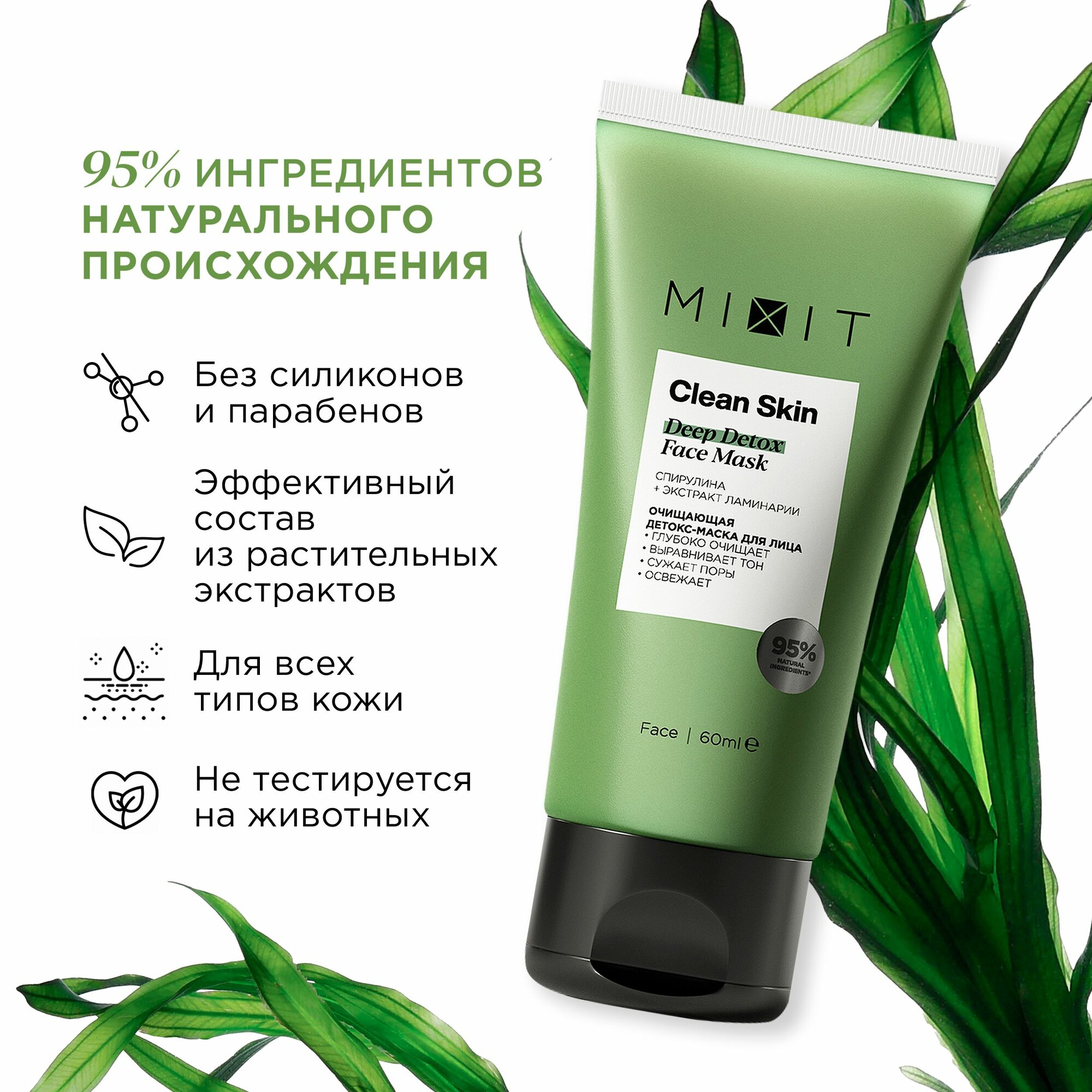 MIXIT Очищающая детокс-маска Clean Skin Deep Detox Face sos Mask with Spirulina для лица от прыщей, 60 мл информация: