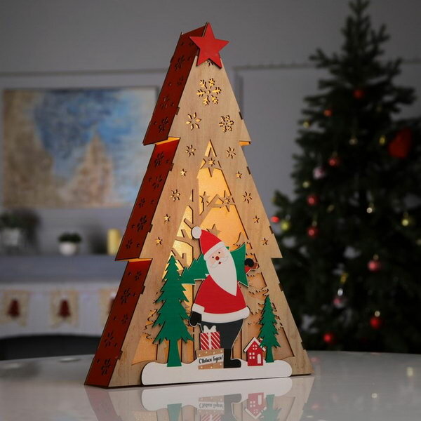 Светодиодная фигура «Ёлка с Дедом Морозом» 13 × 20 × 5 см, дерево, батарейки CR2032х1 (в комплекте), свечение тёплое белое