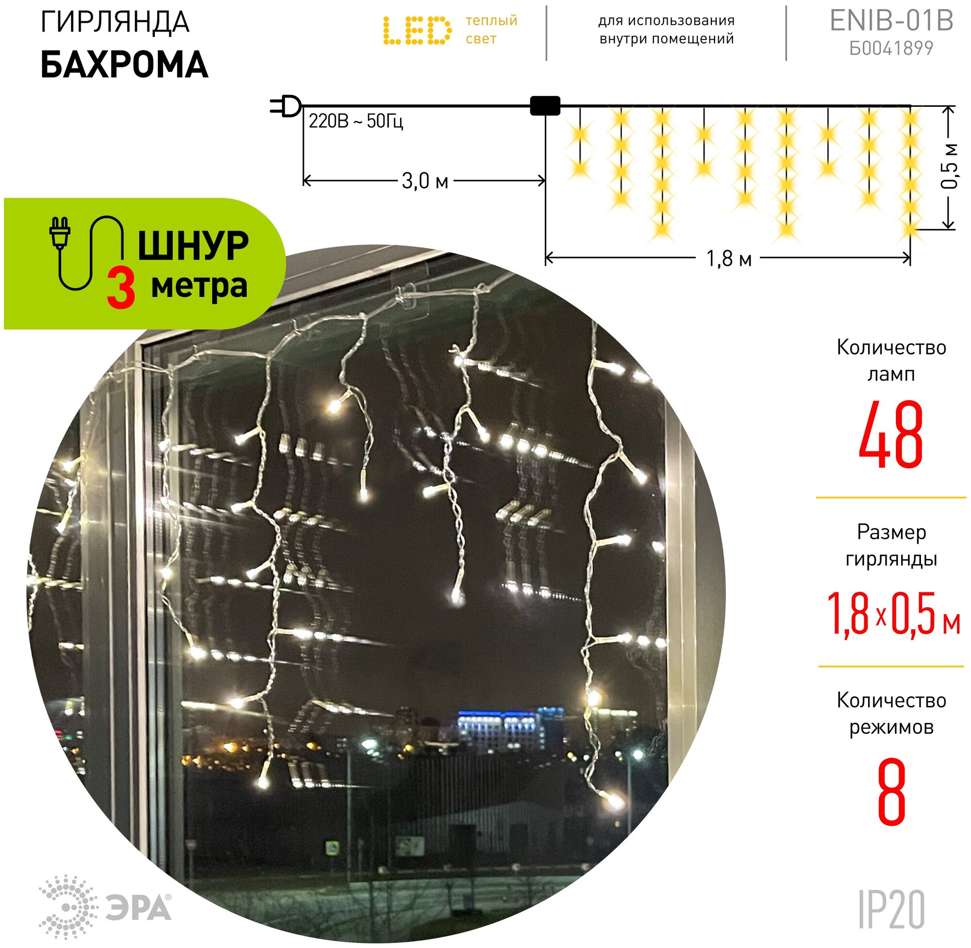 Гирлянда новогодняя светодиодная бахрома ЭРА ENIB-01B на окно, 1.8 м х 0.5 м, 48 LED информация: