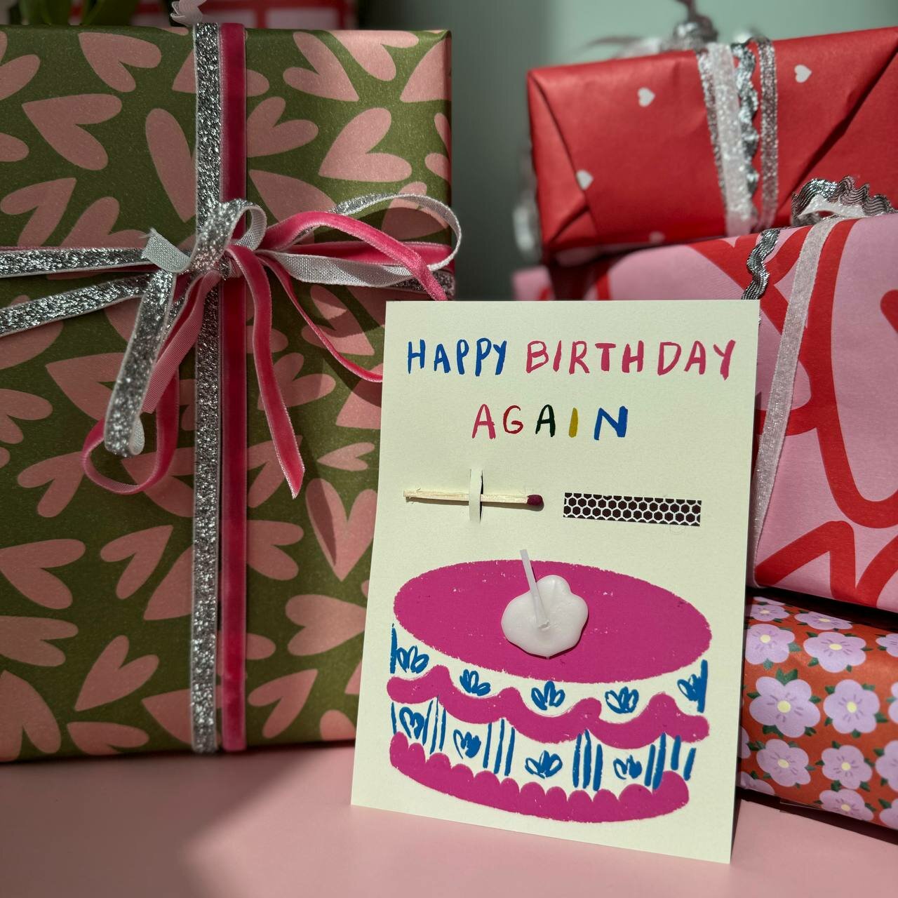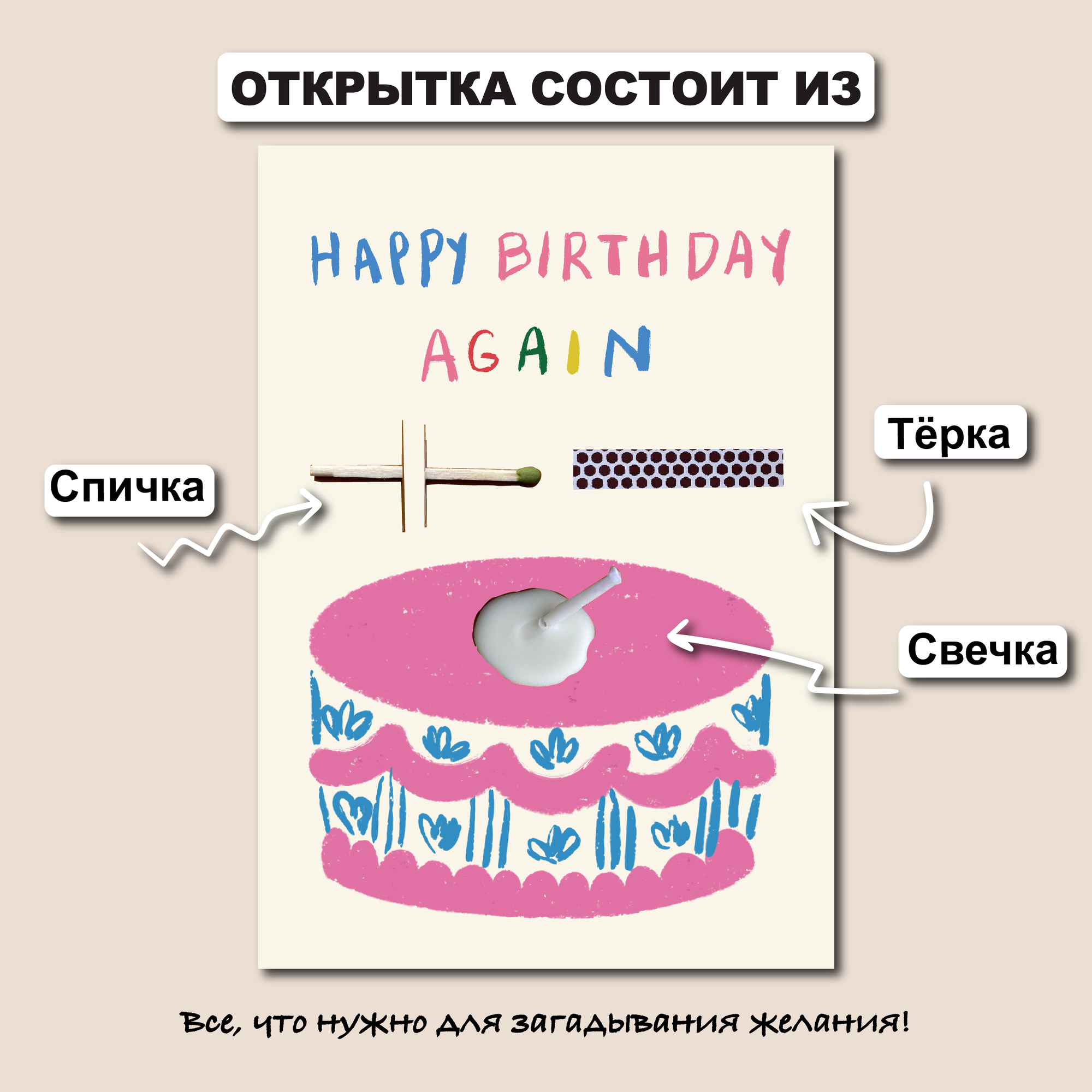 Открытка свечка "Happy birthday again" от Вьюнчик, 14,8х10,5 см (А6), стильная открытка на день рождения 370 ₽