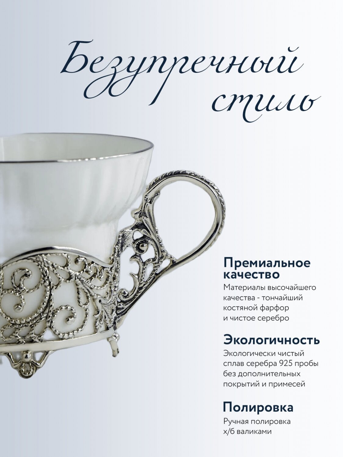 10 цен на Чашка чайная серебро и фарфор "Кружевные узоры" с чернением в футляре