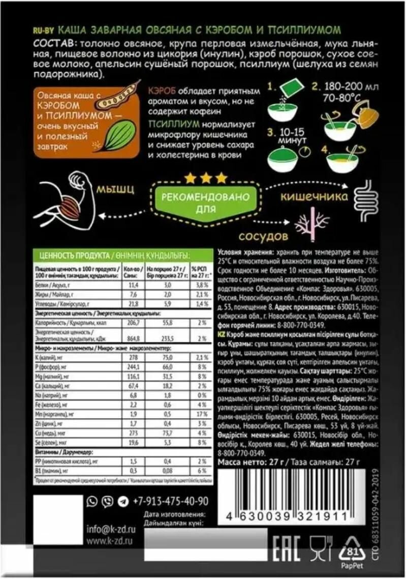 Каша овсяная с кэробом и псиллиумом пакетик, Компас здоровья, (в коробке 10 шт по 27 гр) информация: