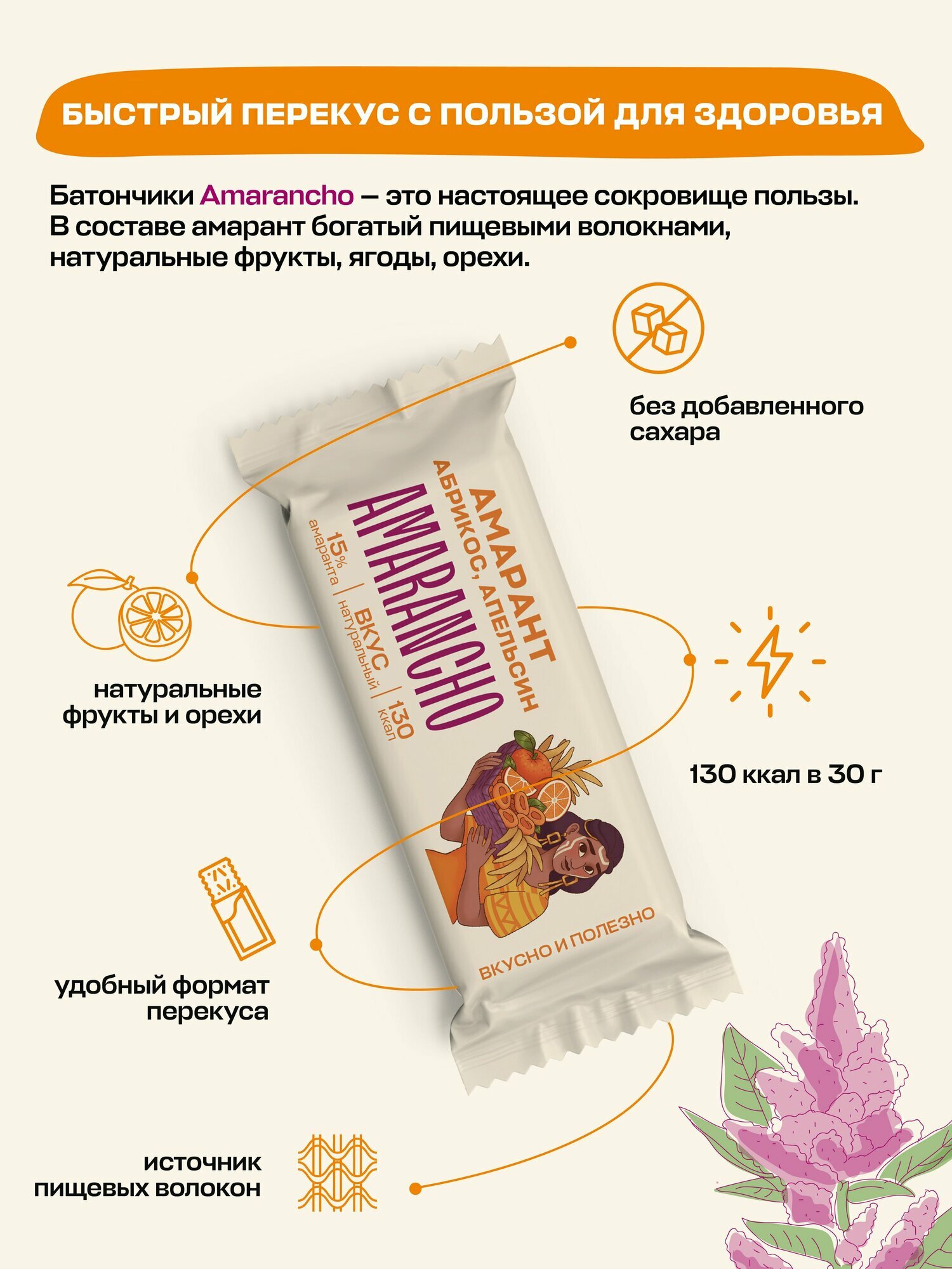 Батончики фруктово-зерновые "Amarancho", амарант, абрикос, апельсин, мюсли без сахара, 9 шт. информация: