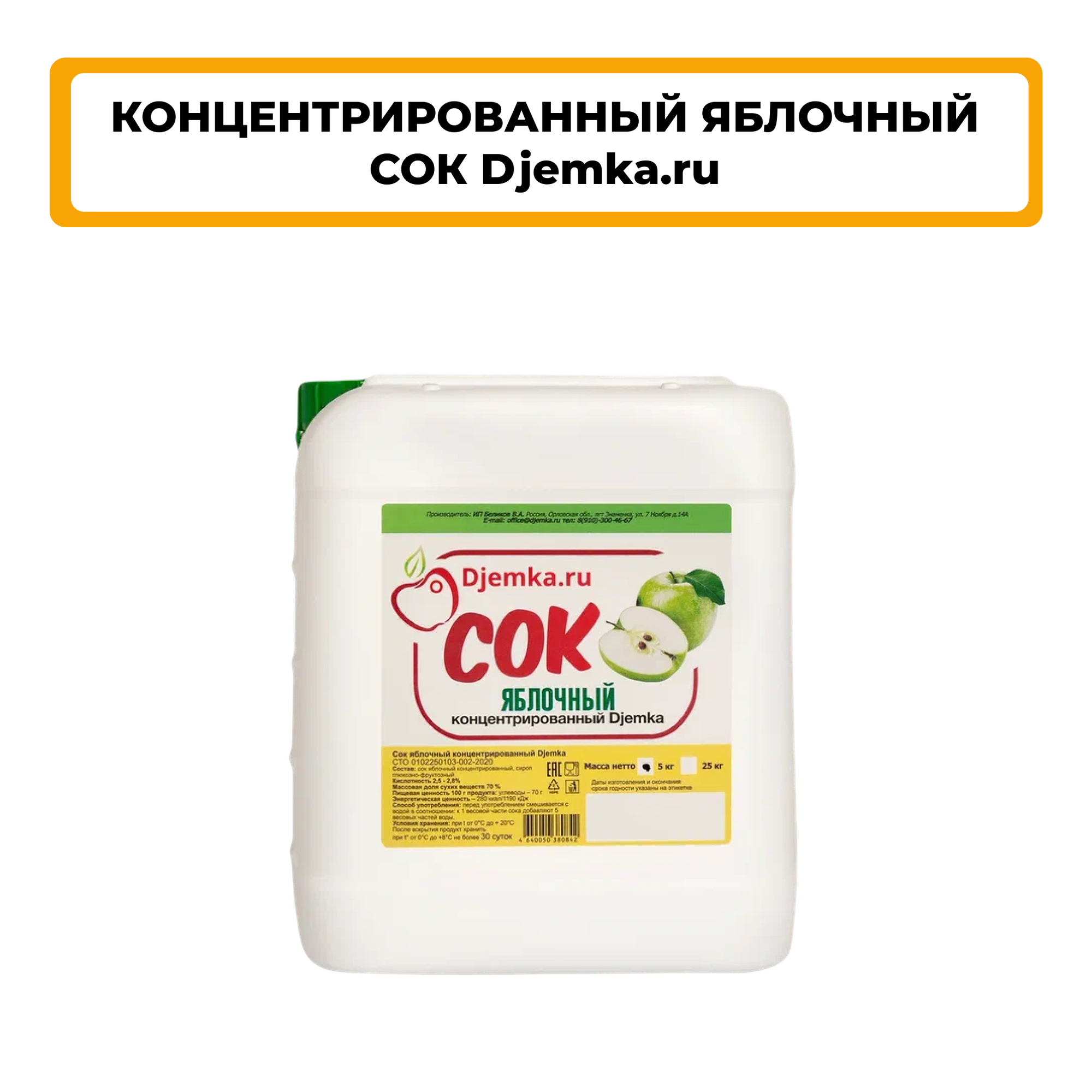 Сок Djemka.ru "Зелёное яблоко", 2,5%, концентрированный, в пластиковой канистре, 5 кг информация: