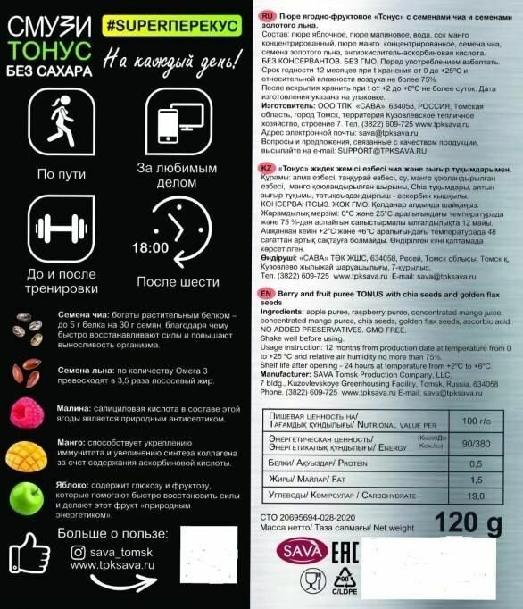 Смузи Тонус без сахара Чиа, лен (манго, малина, яблоко) BioNergy, 10 шт по 120 гр информация: