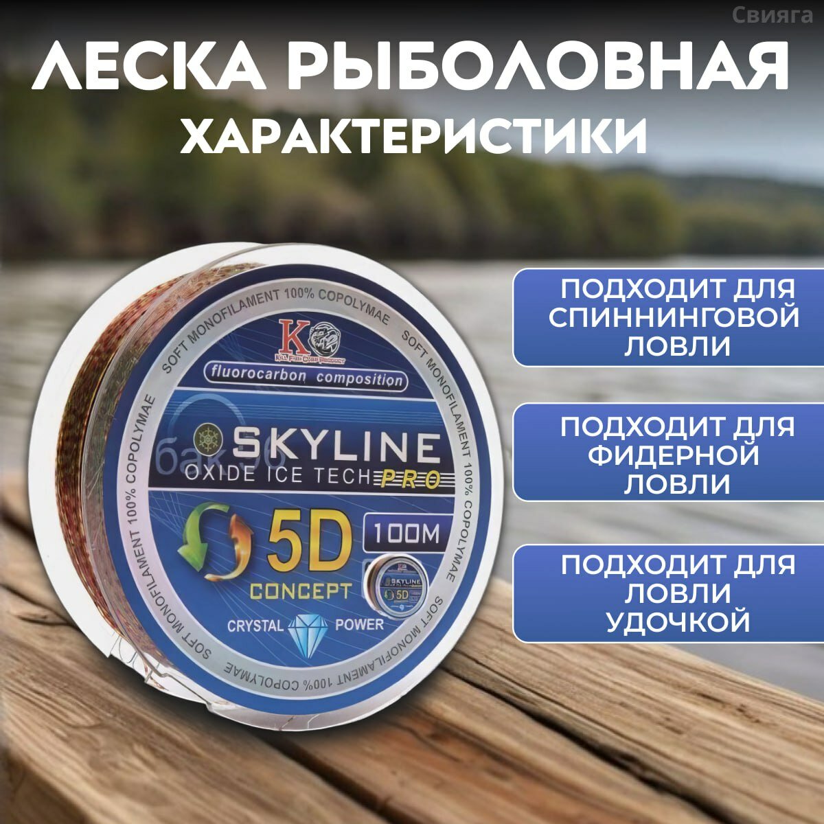 10 цен на Леска рыболовная флюрокарбоновая Skyline 5D, диаметр 0.22 и разрывной нагрузкой 13кг, идеальный подарок на 14 и 23 февраля!