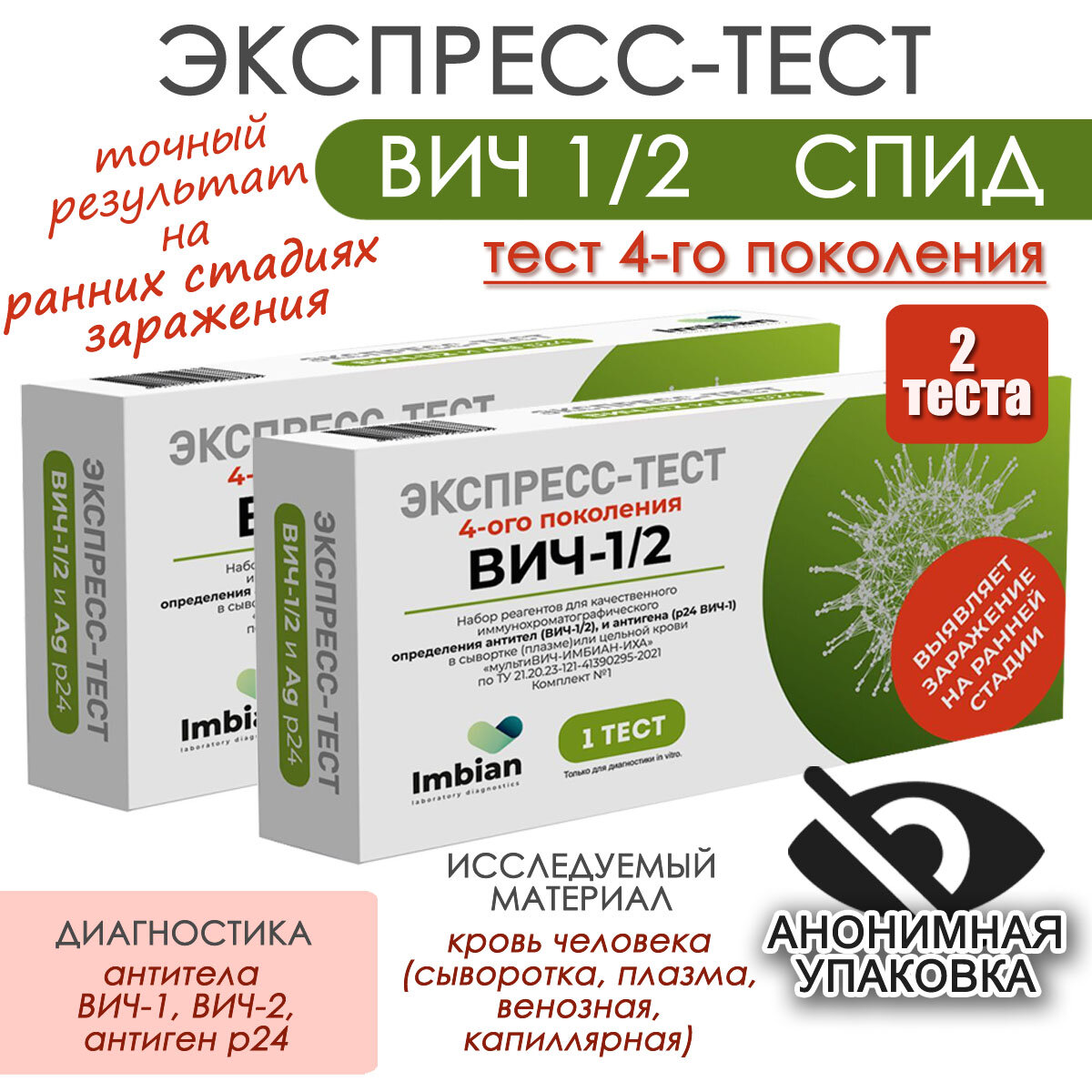 Отзывы на Имбиан Экспресс-тест на Вич 1/2 и Спид 2 шт, анонимная упаковка