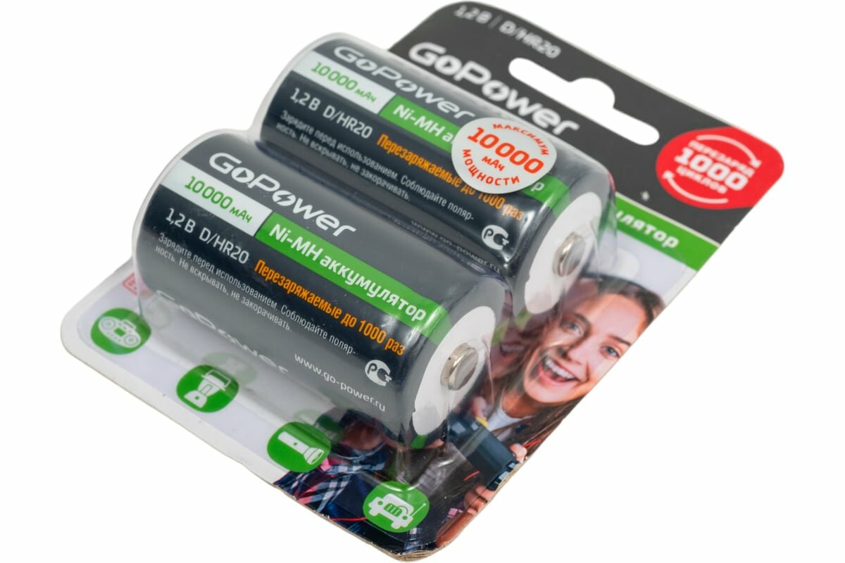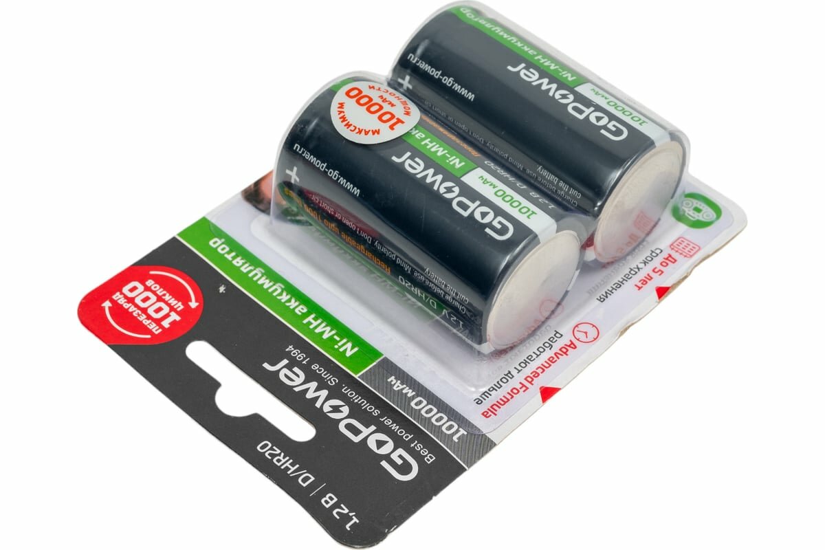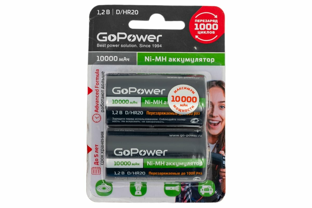 Аккумуляторы GoPower HR20 D, Ni-Mh, 10000 мАч, блистер, 2 шт (00-00018323)