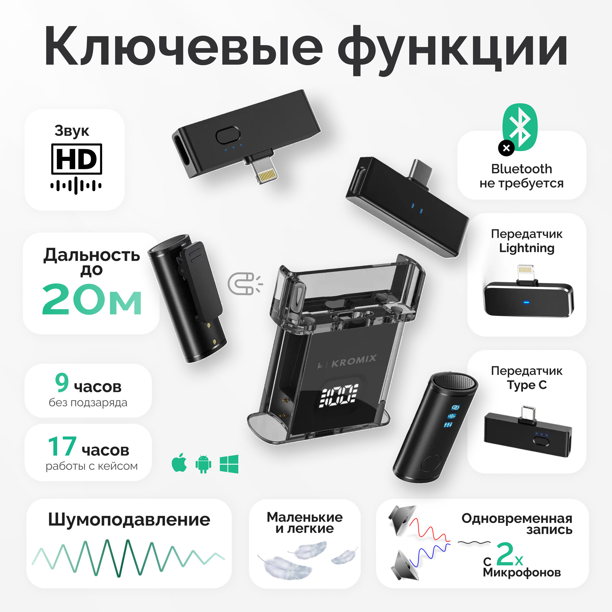 Беспроводной петличный микрофон Kromix K223ML (Lightning) 2 шт. с зарядным кейсом. Петличка для записи звука с шумоподавлением