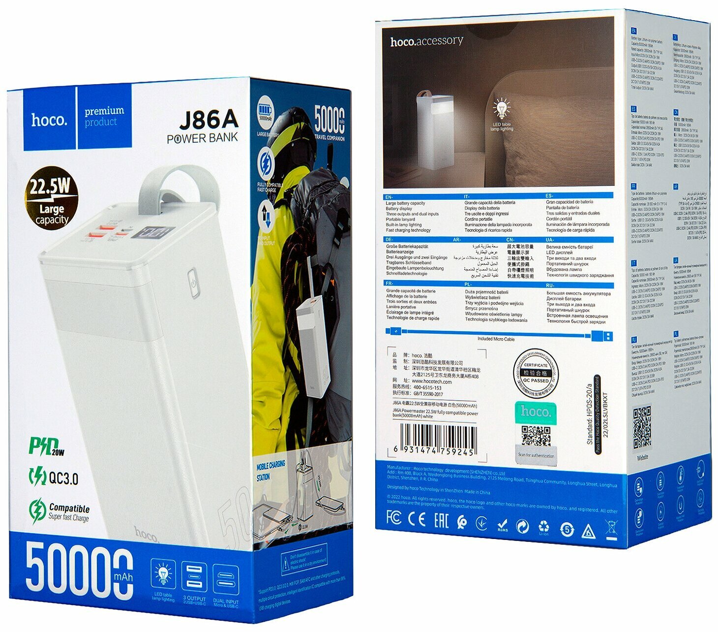Внешний портативный аккумулятор HOCO J86A Powermaster, 22.5W, 3.0А (50000mAh), белый 6931474759245 информация: