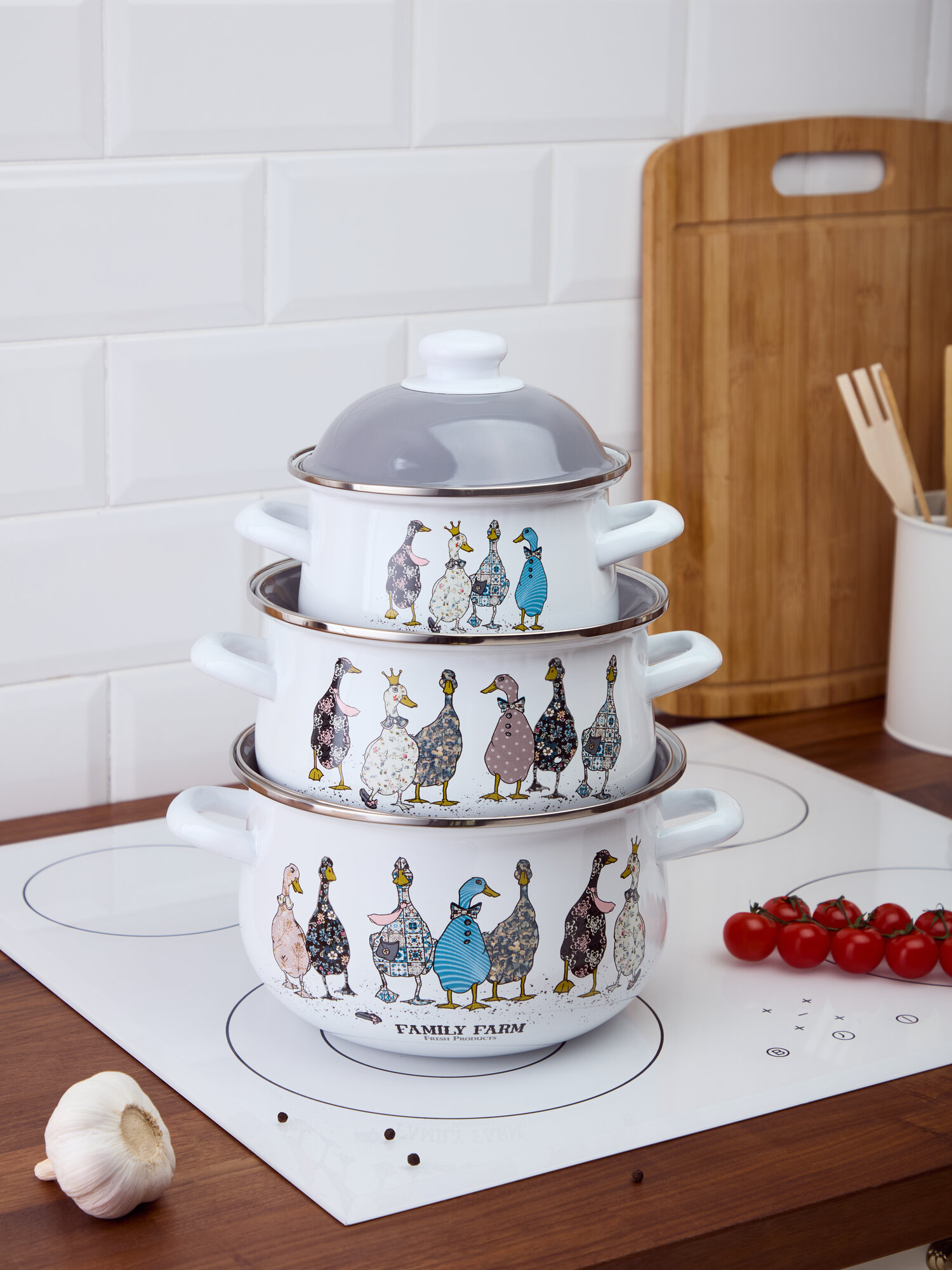 10 цен на Набор кастрюль Agness "Family Farm", эмалированные, для всех видов плит, набор 3 шт. (1.5 л, 2.8 л и 3.6 л), с крышкой