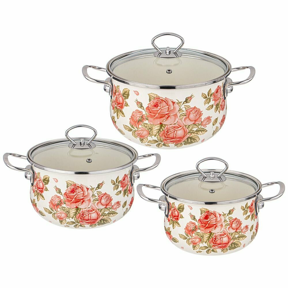 10 цен на Набор кастрюль Agness "Корейская Роза", эмалированные, 3 штуки; по 2 л, 2,8 л и 3,6 л, для всех видов плит