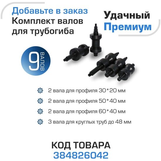 | Комплектация | трубогиб Удачный Премиум, бочкообразный центральный вал - 1 шт, каленные болты - 2 ш, валы для профиля 50х40 - 2 шт, книга чертежей (в PDF), инструкция, гарантийный талон - 1 год, насадка для дрели - 1 шт, валы для профиля 20х30 - 2 шт, цепь на 62 звена - 1 шт, цепь на 78 звеньев - 1 шт, валы для профиля 60 - 2 шт, валы для круглых труб - 3 шт |
