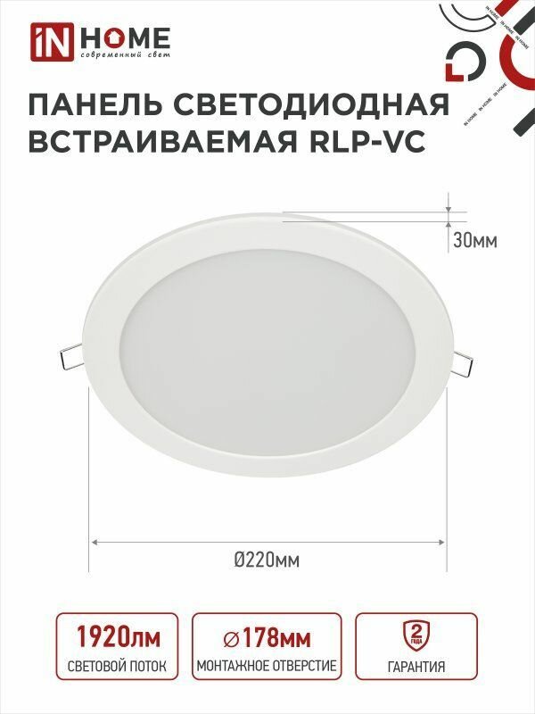 Панель светодиодная встраиваемая круглая RLP-VC 24Вт 230В 6500К 1920Лм 220мм белая IP40 IN HOME информация: