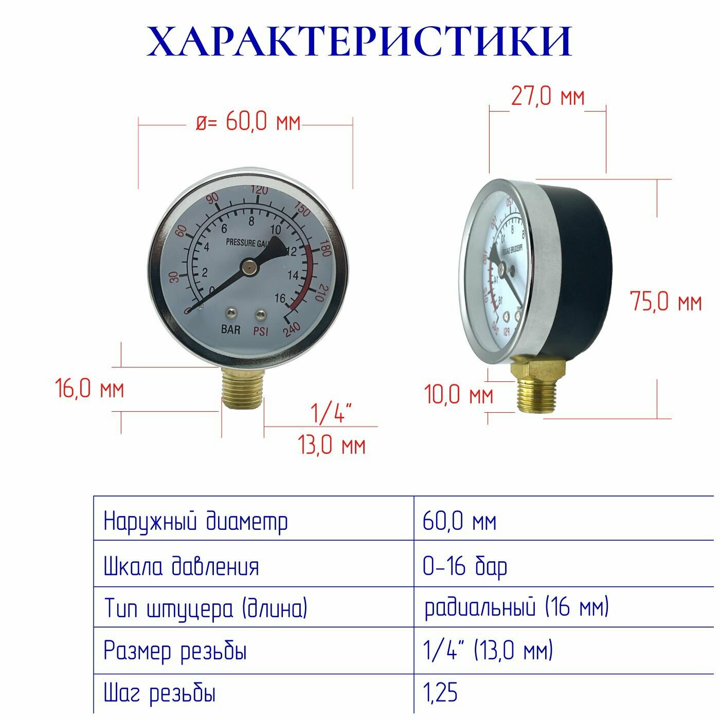 Манометр, измеритель давления для фильтра воды с фитингами и трубкой 1/4" UFAFILTER