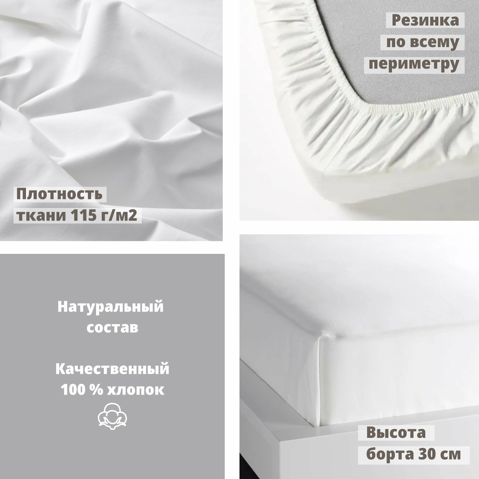 Натяжная простыня на резинке 160х200 поплин 100% хлопок Mary Home Бриллиант белый