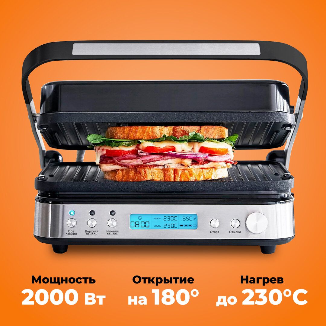 Умный электрогриль Oberhof Grillkonig T-37 с термометром для мяса, 5 степеней прожарки стейка, открытие на 180 градусов, электрический гриль с двусторонними панелями информация: