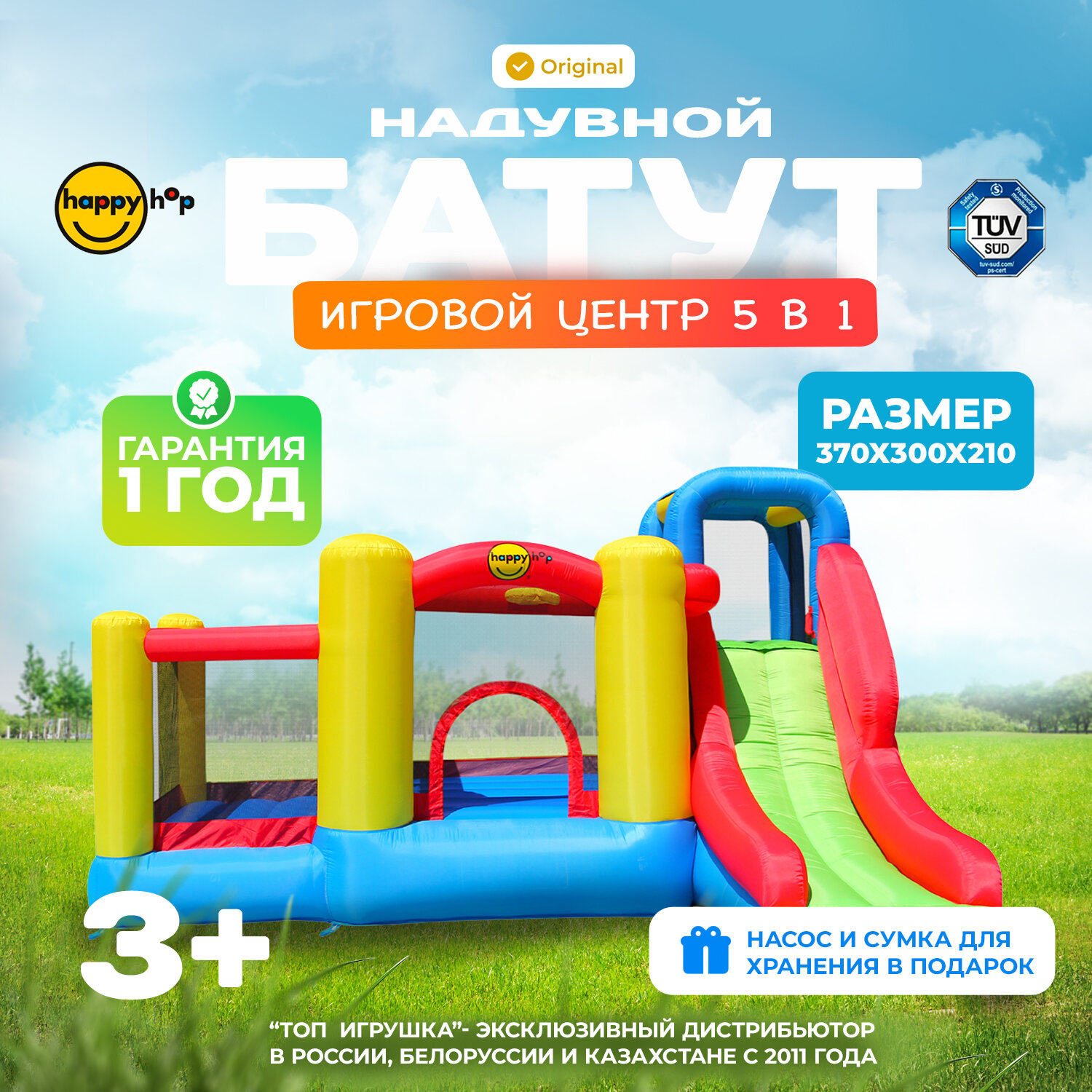 Отзывы на Детский надувной батут Happy Hop для дома и улицы "Игровой центр 5 в 1", с горкой, с защитной сеткой, 370х300х210 см