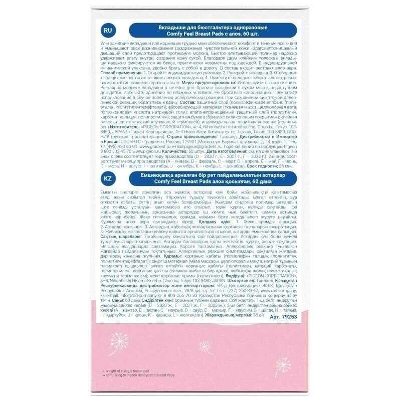 Вкладыши для бюстгальтера Pigeon Comfy Feel Breast Pads, одноразовые, с алоэ, 60 шт информация: