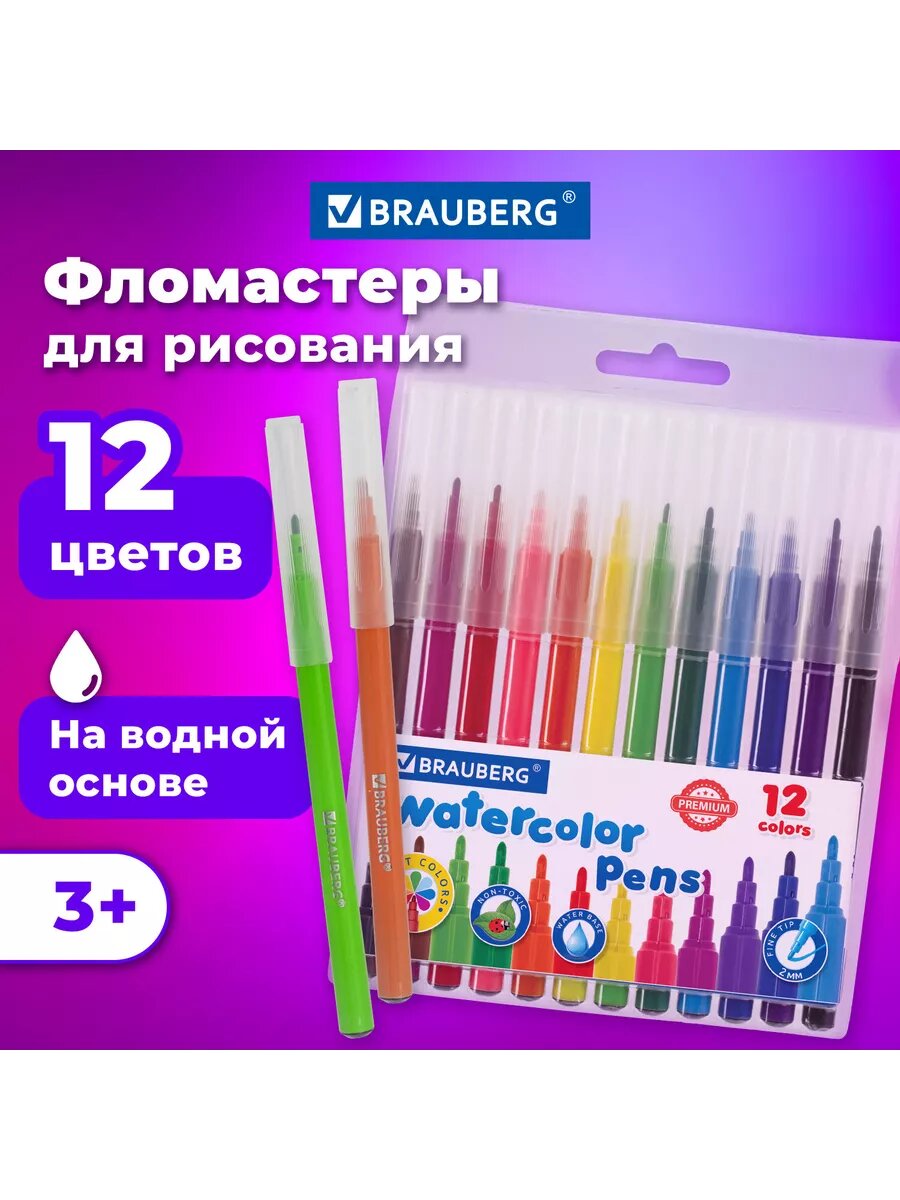 Фломастеры для рисования для детей набор Brauberg Premium, 12 цветов, Корпус С Печатью, вентилируемый колпачок, 151942
