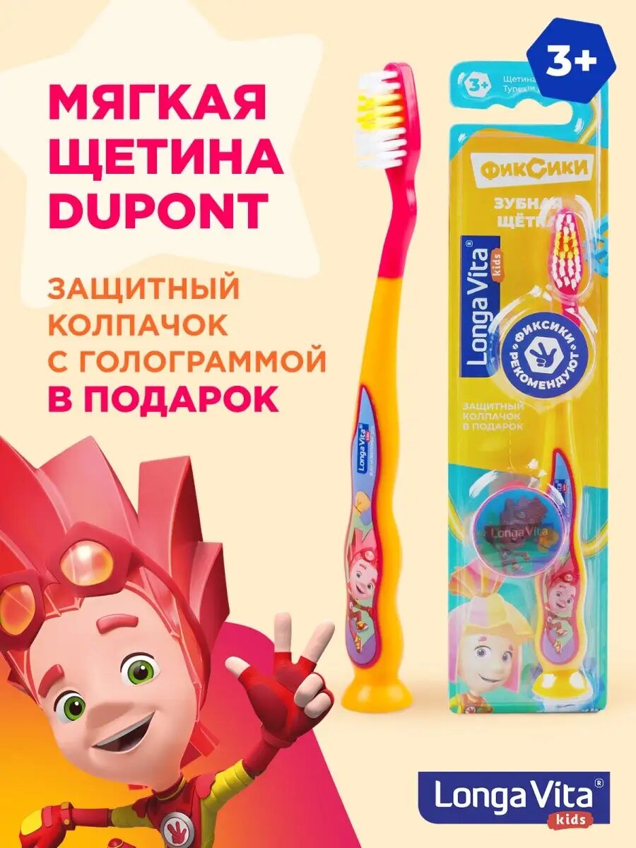 Детская зубная щетка с защитным колпачком, Фиксики, оранжевая, от 3-х лет, Longa Vita