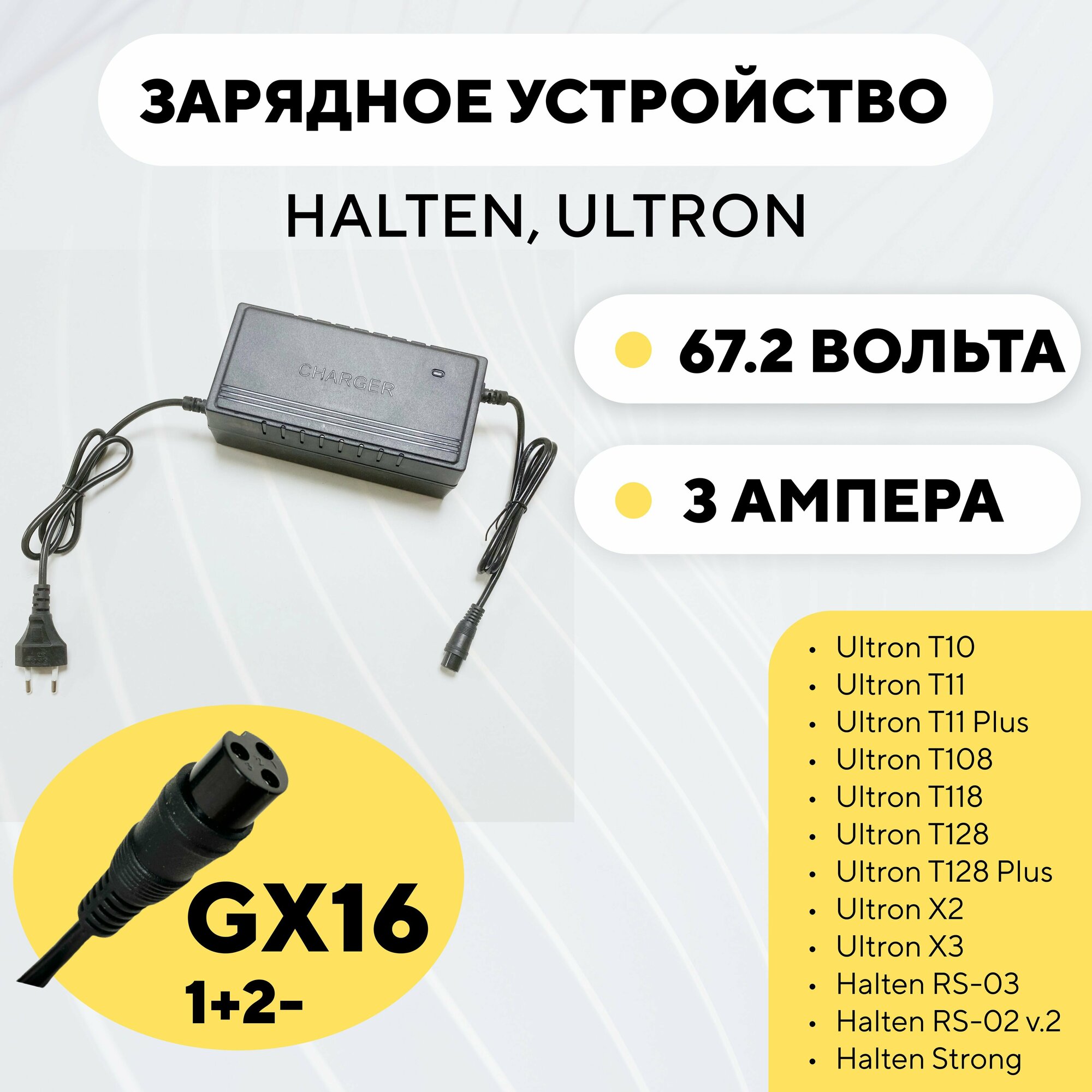 Зарядное устройство 60V 3A для электросамоката Ultron Т10/T11/T108, Halten RS-03 (67.2 Вольта, 3 Ампера) информация: