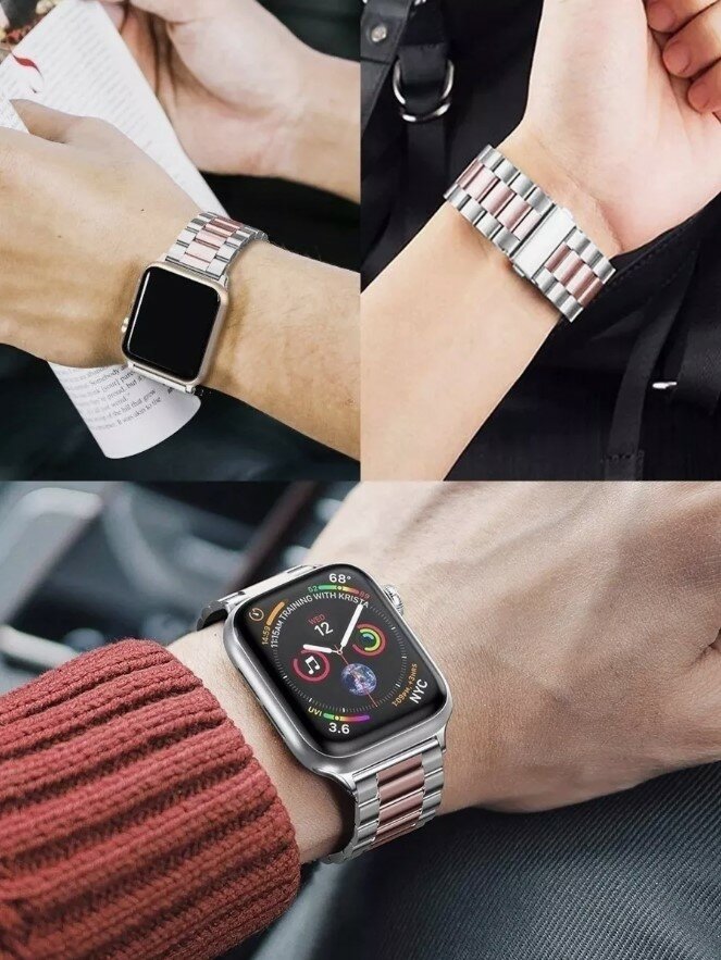 Ремешок металлический из нержавеющей стали для умных смарт часов Apple Watch 42/44/45/49 mm series 1-9 , блочный, Серебристый-розовый 872 ₽
