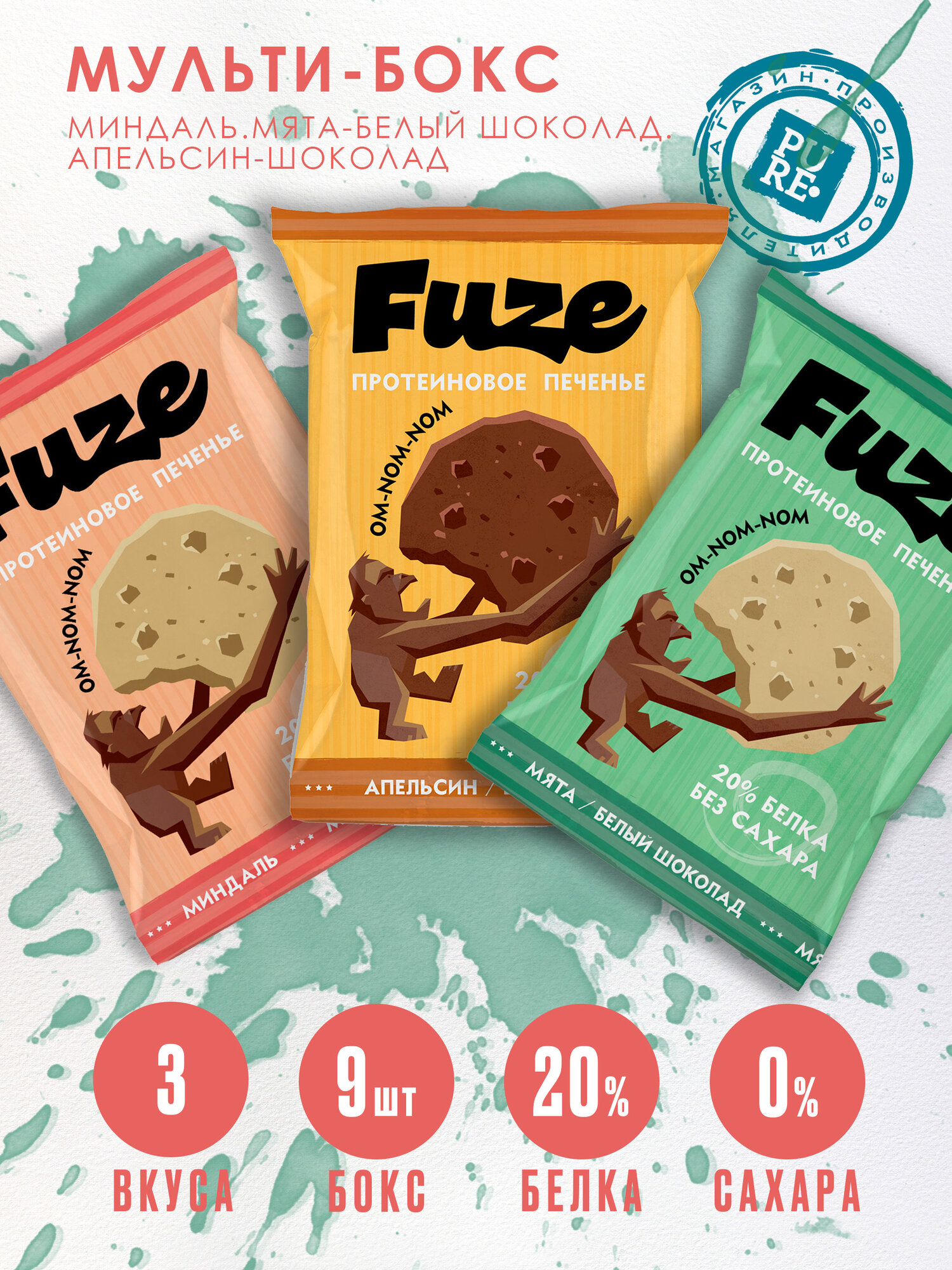 Печенье протеиновое без сахара Fuze. Миндаль, Мята-белый шоколад, Апельсин-шоколад (бокс = 9 уп.)
