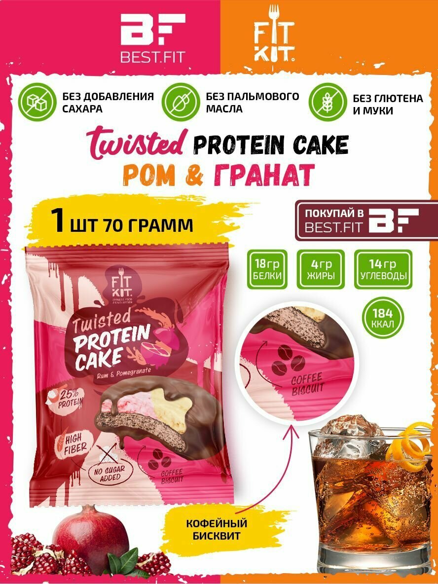 10 цен на Fit Kit, TWISTED Protein Cake, 1шт x 70г (Ром-Гранат) / Протеиновое печенье с суфле без сахара и муки Фит Кит