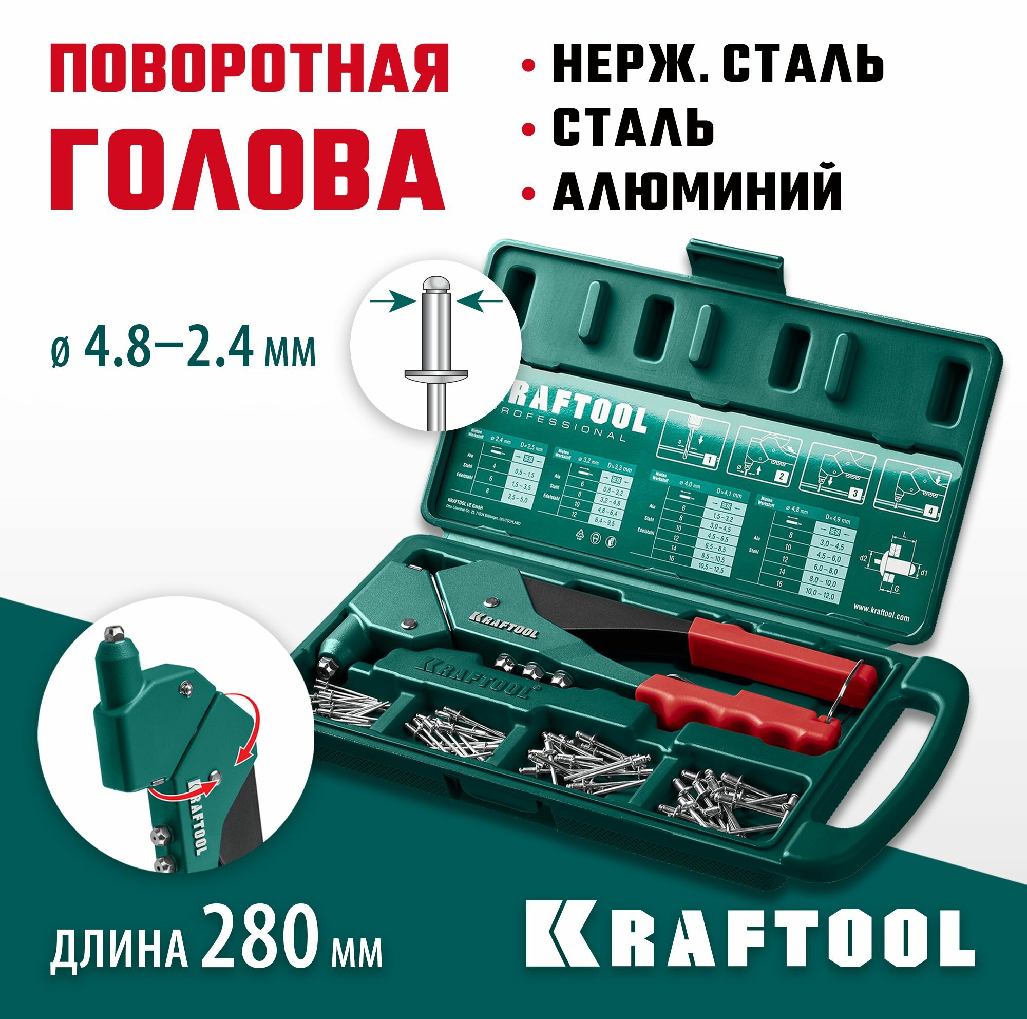 Литой поворотный заклепочник в кейсе KRAFTOOL RX-7, 360, 2.4 - 4.8 мм (31176-H6) информация:
