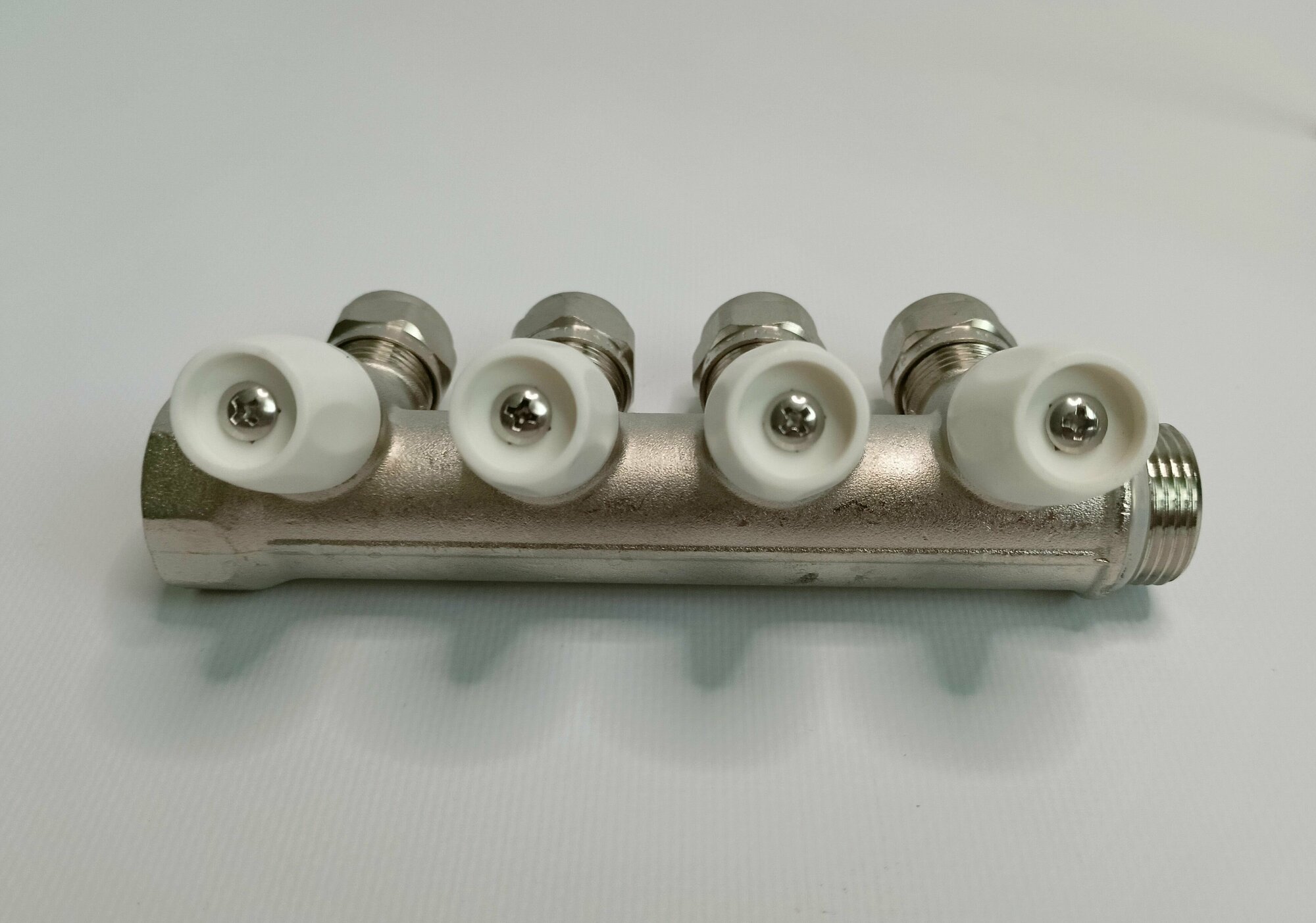Коллектор распределительный вентильный 1", 4 отвода 3/4" под евроконус, никелированный ViEiR арт. VR904