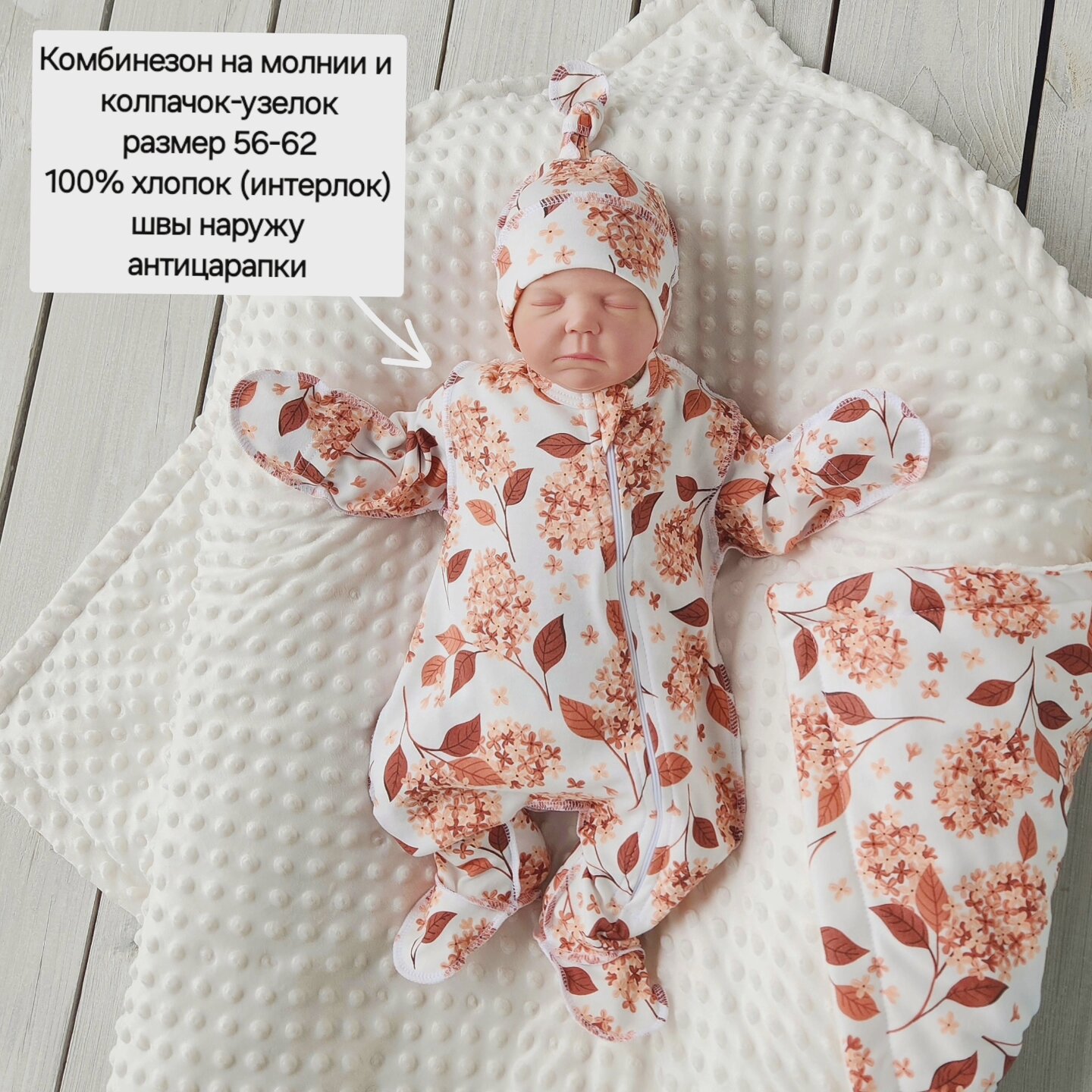 Комплект на выписку из роддома, 4 позиции, лето, размер 56-62, молочный с цветочным рисунком 3 094 ₽