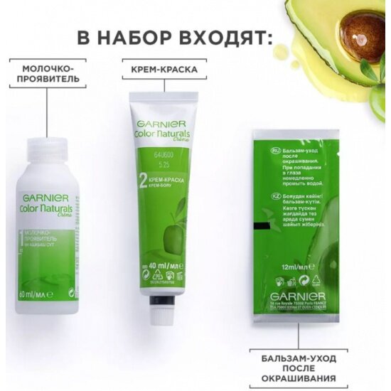 | Способ применения | наденьте защитные перчатки, входящие в состав набора. Выдавите молочко-проявитель и крем-краску в неметаллическую миску. Смешайте их с помощью кисти, нанесите полученную смесь на корни волос, потом распределите по всей длине. Выдержите необходимое время (25-35 минут) и тщательно ополосните водой. Нанесите бальзам-уход, обогащенный 5 маслами, после окрашивания на несколько минут, а затем смойте |