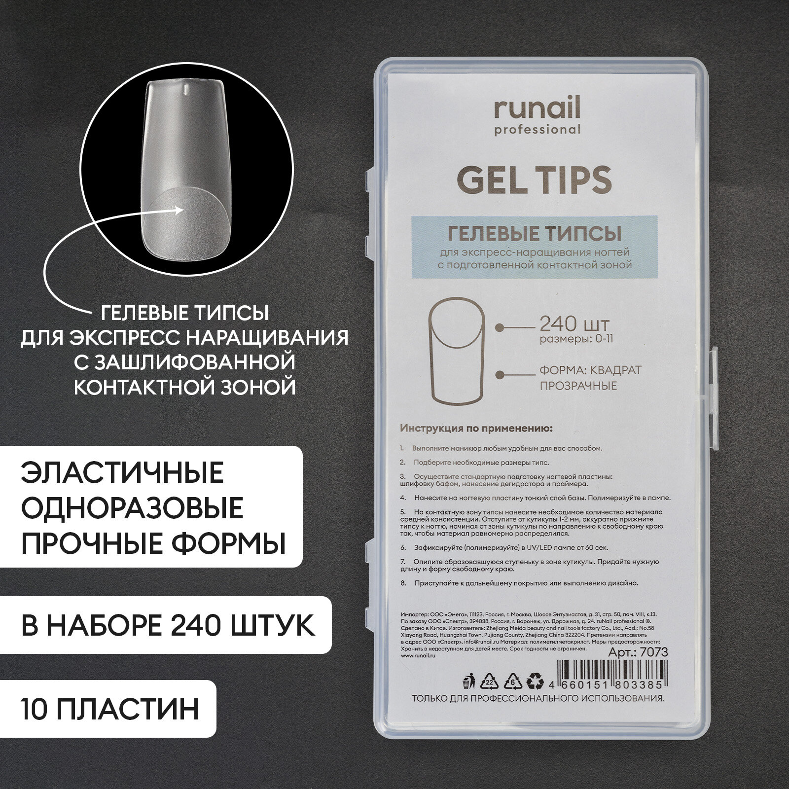 Гелевые типсы для экспресс наращивания прозрачный квадрат (размеры 0-11) 240 шт. №7073 информация: